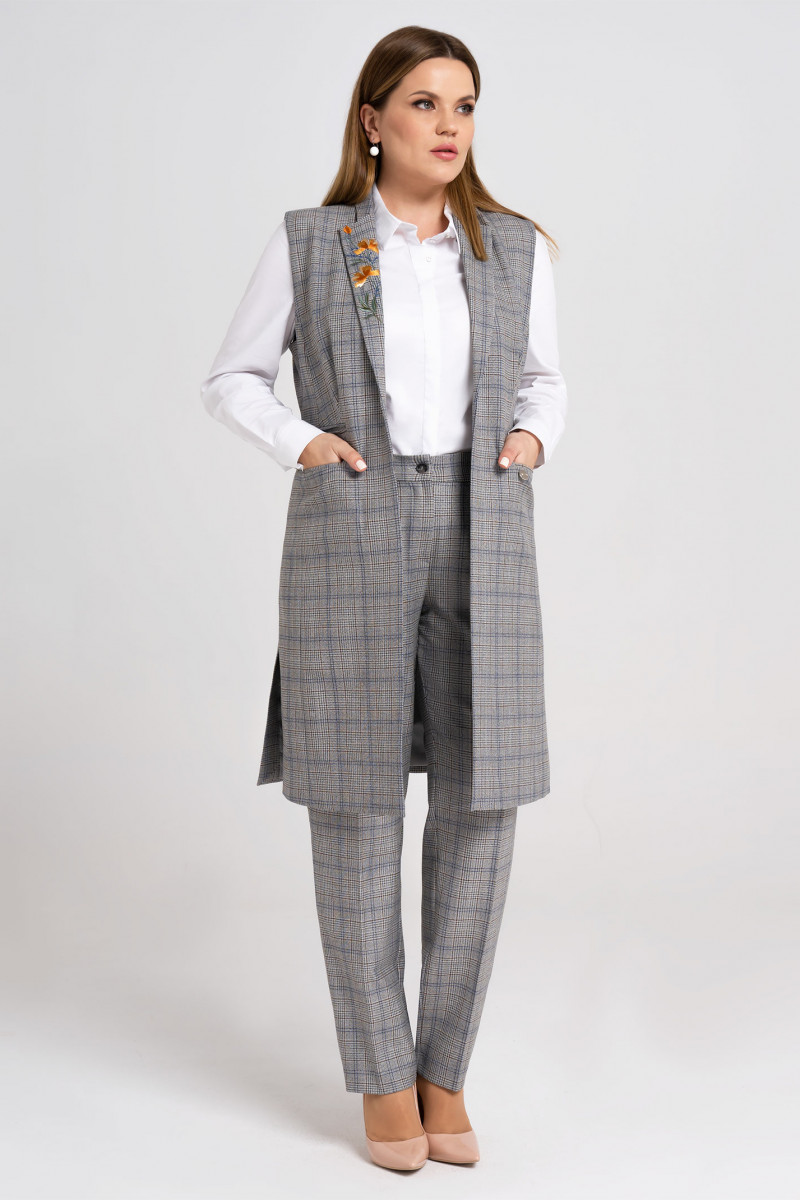 Элегантный, стильный жилет, из поливискозной ткани, рисунок в клетку. Жилет удлиненный, на подкладке, оригинально декорирован вышивкой на лацкане. Детали переда с вытачками, с двумя боковыми карманами в рамку, центральная застежка встык, в боковых швах разрезы. Спинка с рельефными швами, пояс по линии талии. Аккуратные линии кроя в минималистическом стиле- и вы выглядите лаконично и стильно, опять же, этот стильный жилет вы можете одеть в самых разных ситуациях.