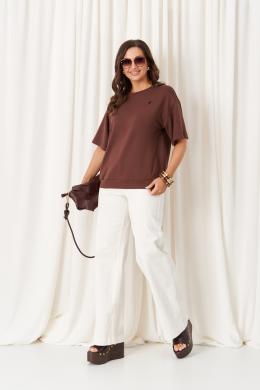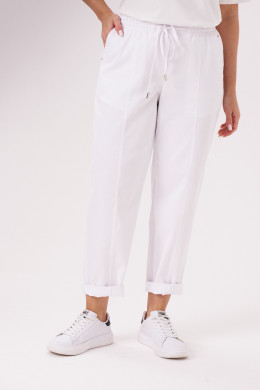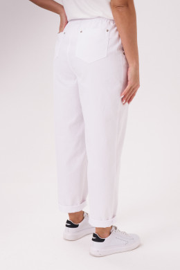 Брюки женские из тонкого джинса -- ткани с большим содержание хлопка для повседневной носки. Брюки свободные, чуть зауженные к низу. Верхний срез брюк обработан притачным поясом со вставкой на резинке, застежка на одну обметанную петлю и одну пуговицу, а также имеется застежка на тесьму-молнию в среднем шве брюк. Передняя часть брюк имеет два кармана с подкройным бочком и декоративные кнопки, а также на передней части брюк располагается шов. Задняя часть брюк имеет два накладных кармана с декоративными кнопками. Очень стильные брюки белого оттенка, которые безусловно будут радовать вас своим чудесным видом и прекрасной посадкой.
