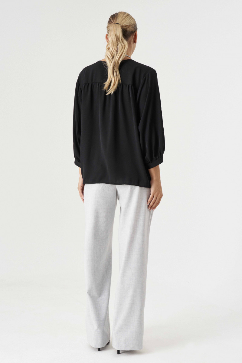 Блуза из струящейся ткани для повседневной носки. Блуза свобожного силуэта с фронтальной застежкой на пуговицы, длинным втачным рукавом. Рукав оформлен притачной манжетой. Спинка с отрезной кокеткой. Длина изделия классическая.