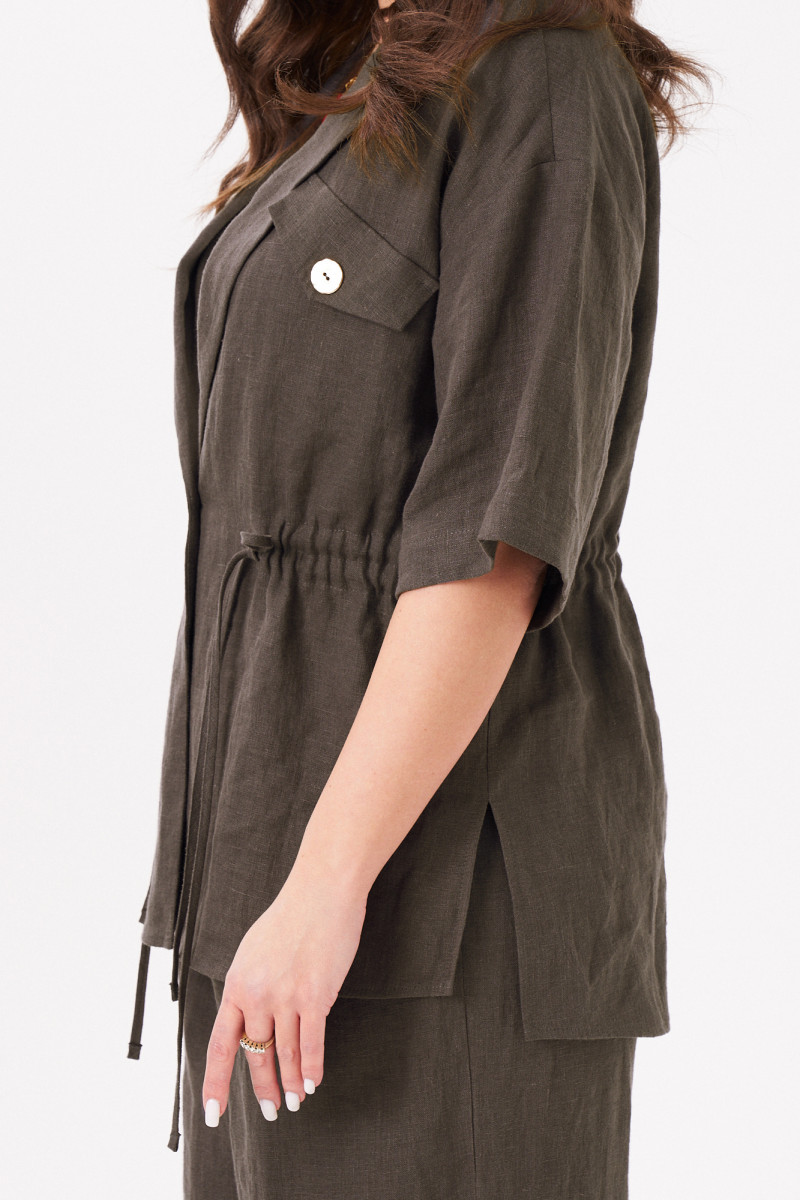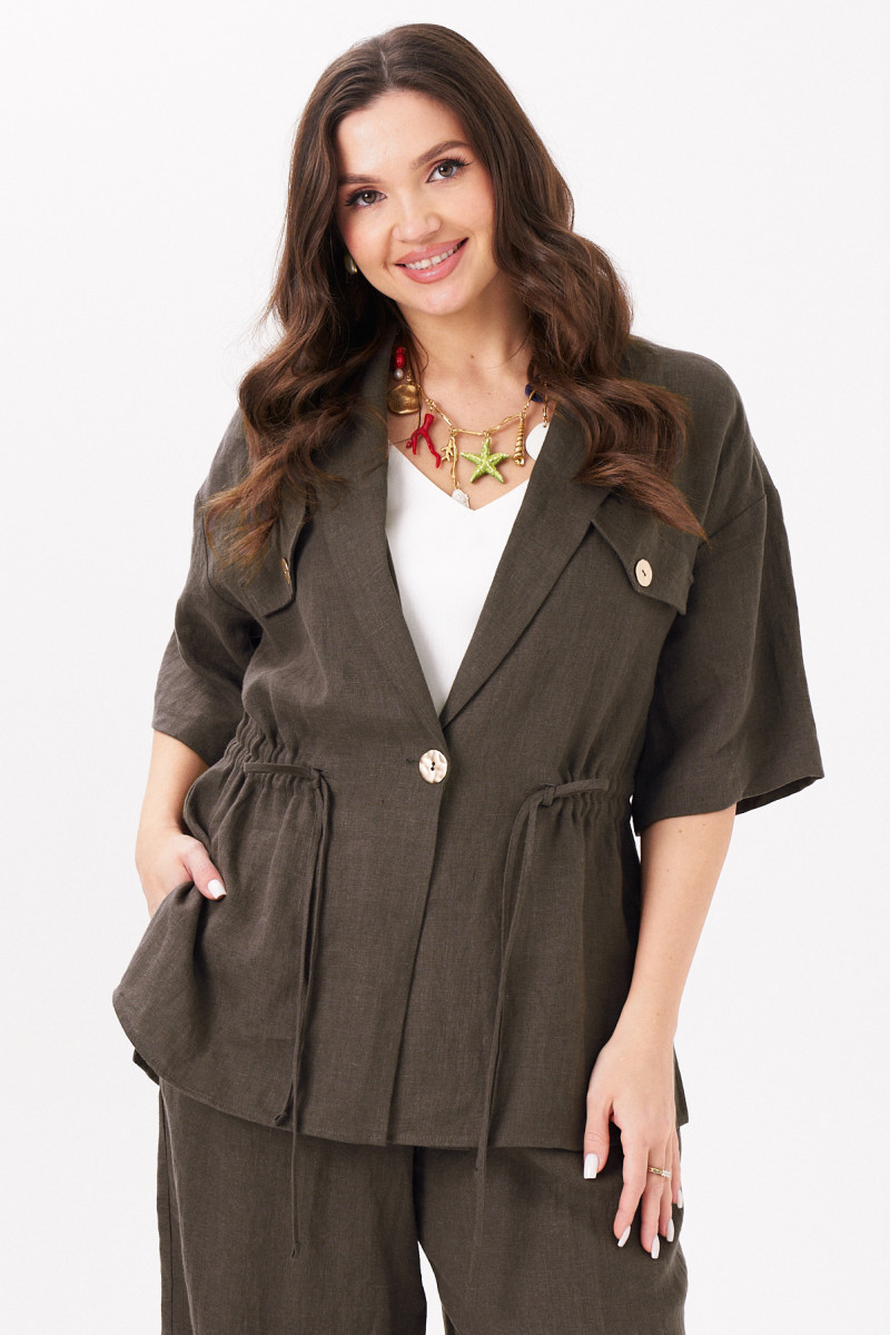 Женский жакет из льняной ткани — идеальный выбор для тех, кто ищет универсальный элемент гардероба. Этот классический пиджак прямого силуэта сочетает в себе элегантность и комфорт, подходя как для повседневной, так и для офисной носки. Свободный крой с утягивающей кулисой на талии позволяет адаптировать посадку под любую фигуру, делая образ более утонченным или расслабленным по желанию. Пиджачный воротник, спущенная линия плеча и втачные рукава длиной чуть ниже локтя создают легкий и стильный силуэт. Центральная застежка на пуговицу и декоративные клапаны с пуговицами придают нарядный акцент даже в базовом исполнении. Жакет особенно актуален как весенний или летний вариант — благодаря натуральной льняной ткани он обеспечивает комфорт в теплое время года. Этот женский пиджак легко комбинируется с деловыми брюками, юбками, джинсами, превращаясь из повседневного в праздничный элемент гардероба. Подходит для офиса, деловых встреч, прогулок, свиданий и торжественных мероприятий. Такой офисный и одновременно женственный жакет станет незаменимым решением для тех, кто ценит стиль, удобство и практичность. Добавьте в свой гардероб этот праздничный и в то же время повседневный пиджак, чтобы выглядеть безупречно в любой ситуации.