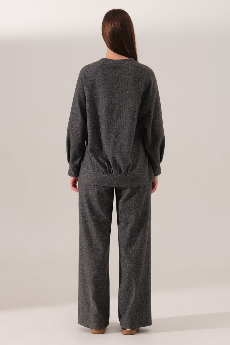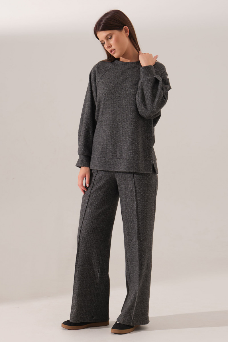 Комплект женский из смесового трикотажного плотна для повседневной носки. Комплект состоит из джемпера и брюк. Джемпер с притачным поясом по низу изделия. Спинка имеет складки по верхнему срезу пояса. В боковых швах имеются разрезы. Горловина круглая. В боковом шве имеются небольшие разрезы. Рукава реглан длинные, низ рукава обработан притачной манжетой. Верхний срез брюк обработан притачным поясом на резинке. В боковых швах имеется боковой прорезной карман с подкройным бочком. На задней части брюк располагаются накладные карманы. Очень стильный и удобный комплект на каждый день.