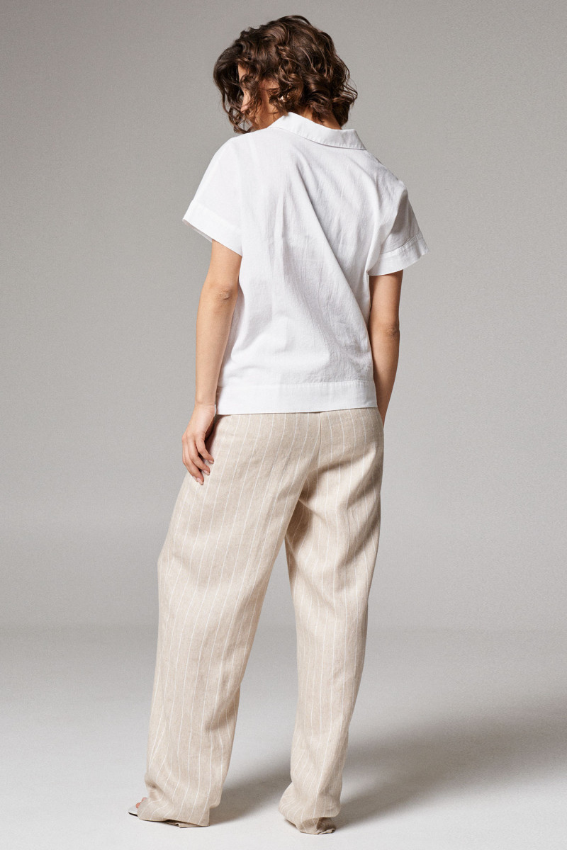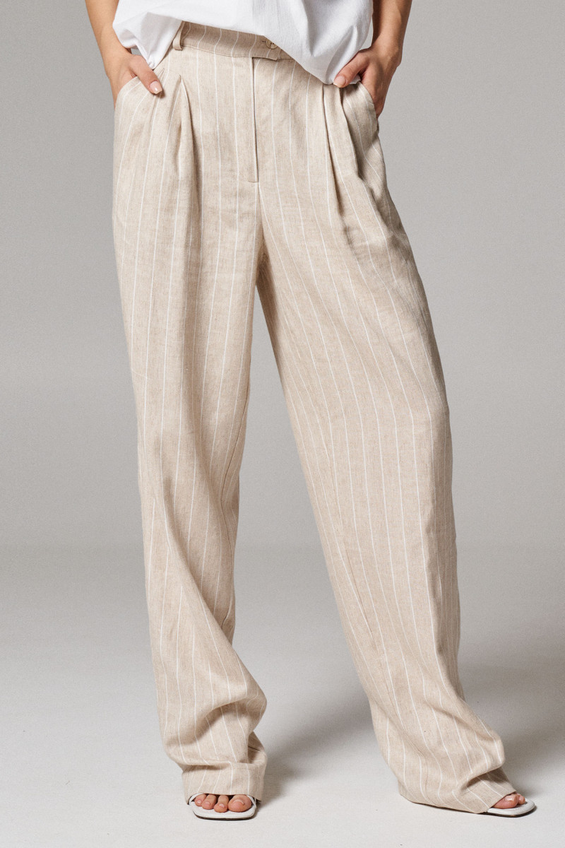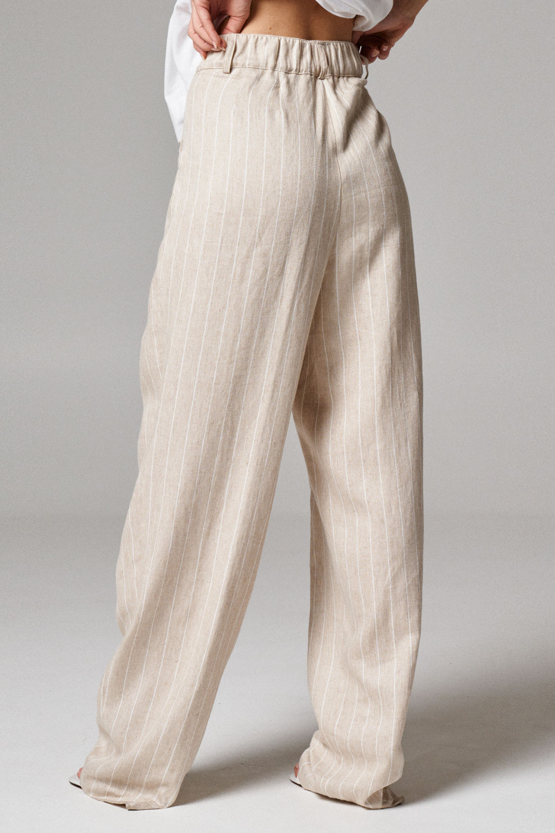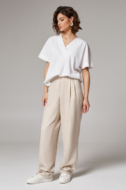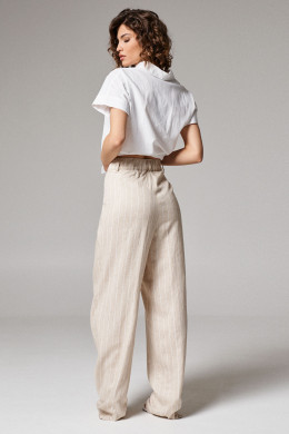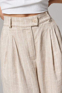 Брюки женские из льняной ткани с добавлением вискозы для повседневной носки. Изделие прямого силуэта на поясе. В боковых швах прорезные карманы. По переду по два защипа с каждой стороны. Длина брюк классическая.