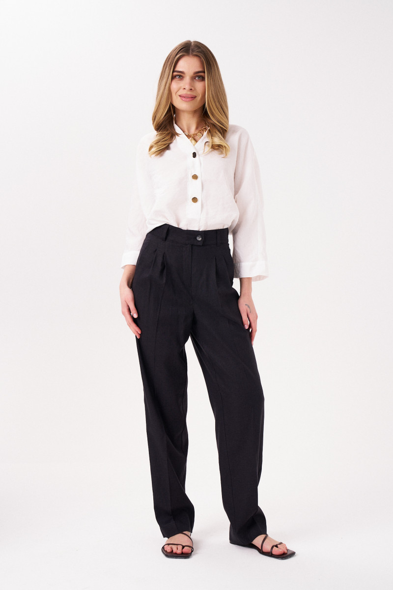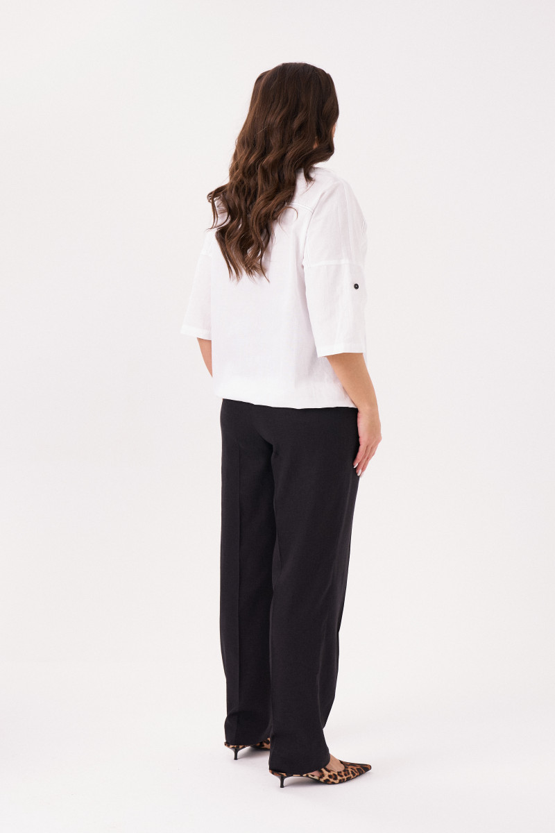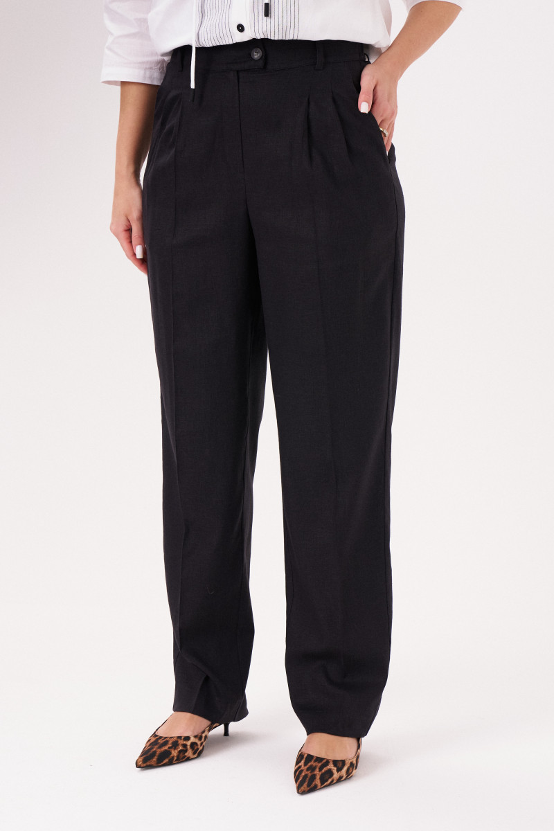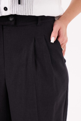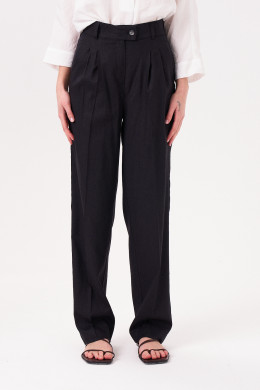 Брюки женские прямые из смесовой ткани для повседневной носки. Верхний срез брюк обработан притачным поясом, застежка на одну петлю и одну пуговицу, а также имеется застежка на тесьму-молнию в среднем шве брюк. Задняя часть брюк имеет вытачки, входящие в прорезной карман в рамку с двумя обтачками. В брюках расположен в боковом шве карман с подкройным бочком и с небольшими разрезами к низу изделия. Отличный классический вариант брюк, которые будут гармонично смотреться под любые изделия.