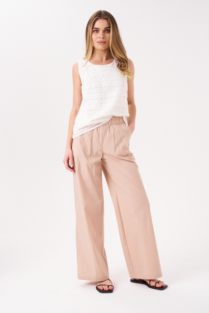 Брюки женские из хлопковой ткани для повседневной носки. Брюки прямого силуэта на поясе. Пояс на резинке, в боковых швах прорезные карманы. Длина брюк классическая.