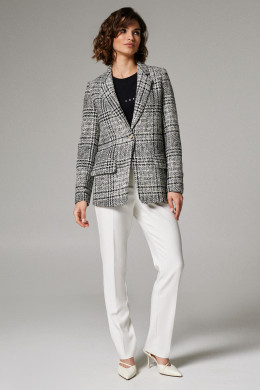Жакет женский из костюмной ткани для повседневной носки. Жакет однобортный на поливискозной подкладке с длинным рукавом.Изделие полуприлегающего силуэта с отложным воротником, прорезными карманами по переду.
