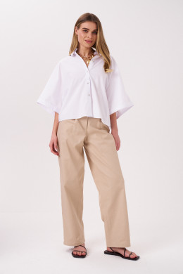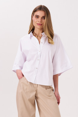 Блуза женская из хлопковой ткани для повседневной носки. Блуза свободная укороченная с фронтальной застежкой на пуговицы. Рукав цельнокроеный укороченный. По низу рукава отложная манжета. По спинке отрезная кокетка. Низ прямой.