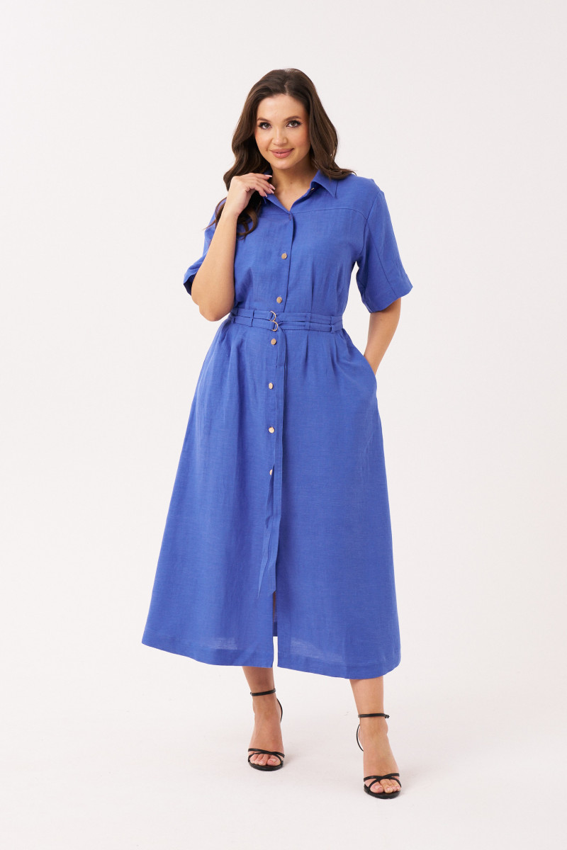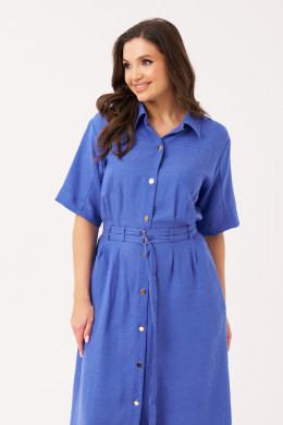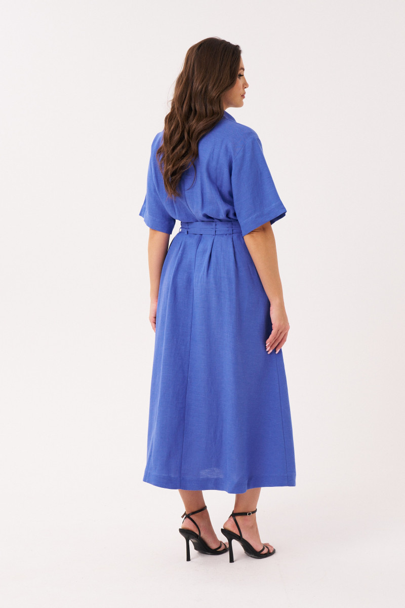 Платье женское из льняной ткани для повседневной носки. Платье полуприлегающего силуэта. Застежка в платье центральная бортовая на обметанные петли и пуговицы. Платье имеет отрезную кокетку, переходящую на рукав и четыре защипа, а также имеются шлевки за счет чего платье можно носить под пояс. Спинка со средним швом. Горловина обработана рубашечным воротником с отрезной стойкой. Рукава втачные длиной на уровне локтя. Платье длиной миди. Стильное