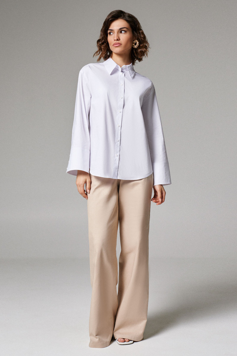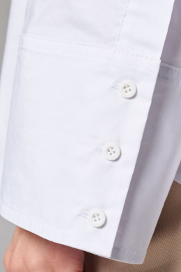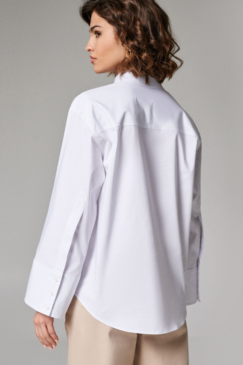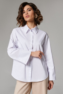 Блуза женская из хлопковой ткани для повседневной носки. Блуза с воротником-стойкой, фронтальной застежкой на петли-пуговицы. По спинке блузки отрезная кокетка. Рукав втачной длинный, оформленым широкой манжетой, застёгивающиеся на петли-пуговицы.