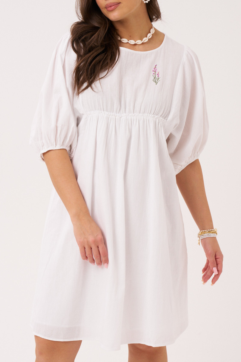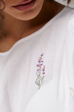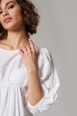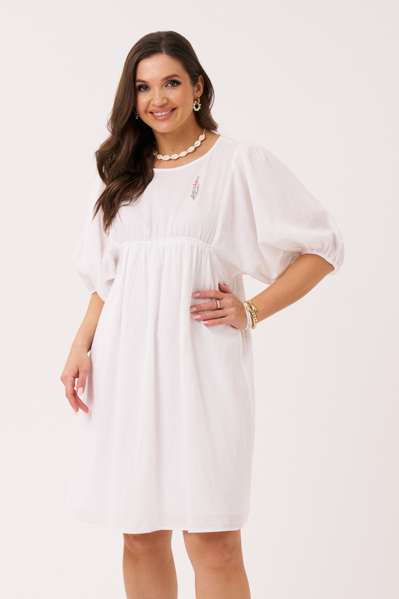 Платье женское из хлопковой ткани для повседневной носки. Платье свободного кроя, длиной до коленей. Платье с круглым вырезом горловины, отрезное чуть выше талии. От подреза имеется сборка. По переду платье имеет небольшую декоративную вышивку. Рукава длиной до локтя, низ рукавов оформлен резинкой с декоративной сборкой по низу. Платье имеет хлопковую подкладку. которая вставлена в подрез чуть выше талии.