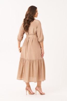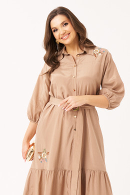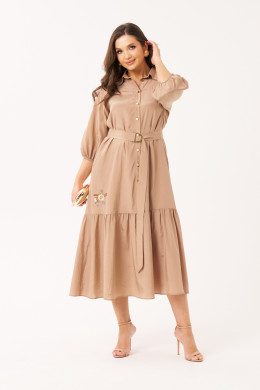 Перед платья украшен кокеткой с дизайнерской вышивкой в виде подсолнухов, что придает изделию уникальности и изысканности. Также, вышивка расположена по низу переда, подчеркивая его изящество. Спинка платья с отрезной кокеткой усиливает стильный образ, а горловина, обработанная рубашечным воротником с отрезной стойкой, добавляет нотки делового стиля. Рукава, длиной чуть ниже локтя, обработаны окантовочной тесьмой с небольшой сборкой, что придает платью утонченность.