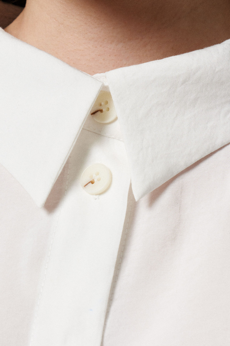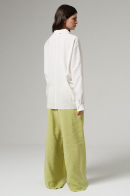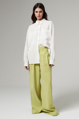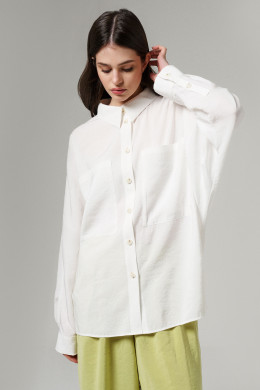 Блуза из вискозной ткани для повседневной носки. Изделие прямого силуэта с длинным цельнокроеным рукавом, оформленым притачной манжетой. Блыза с фронтальной застежкой на пуговицы, воротник отложной на стойке. По переду накладные карманы, Длина изделия классическая.