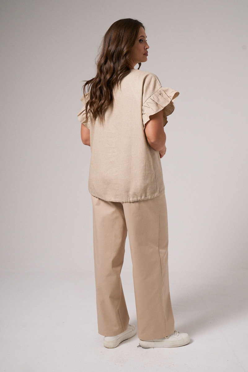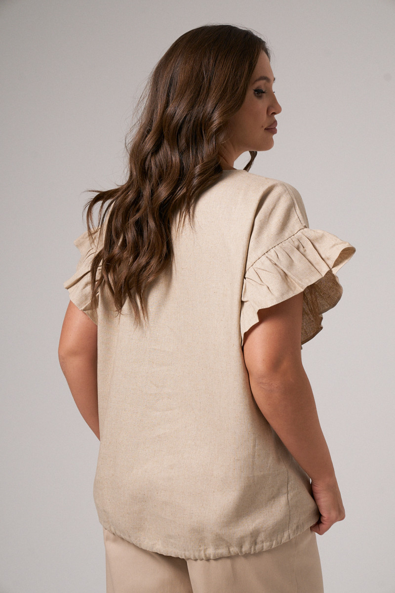 Блуза женская из льняной ткани для повседневной носки. Горловина круглая, пройма оформлена сборкой. По низу изделия кулиса.