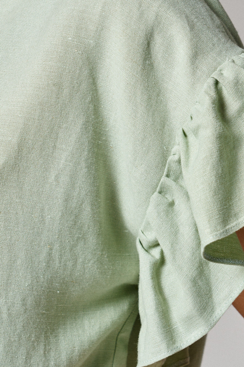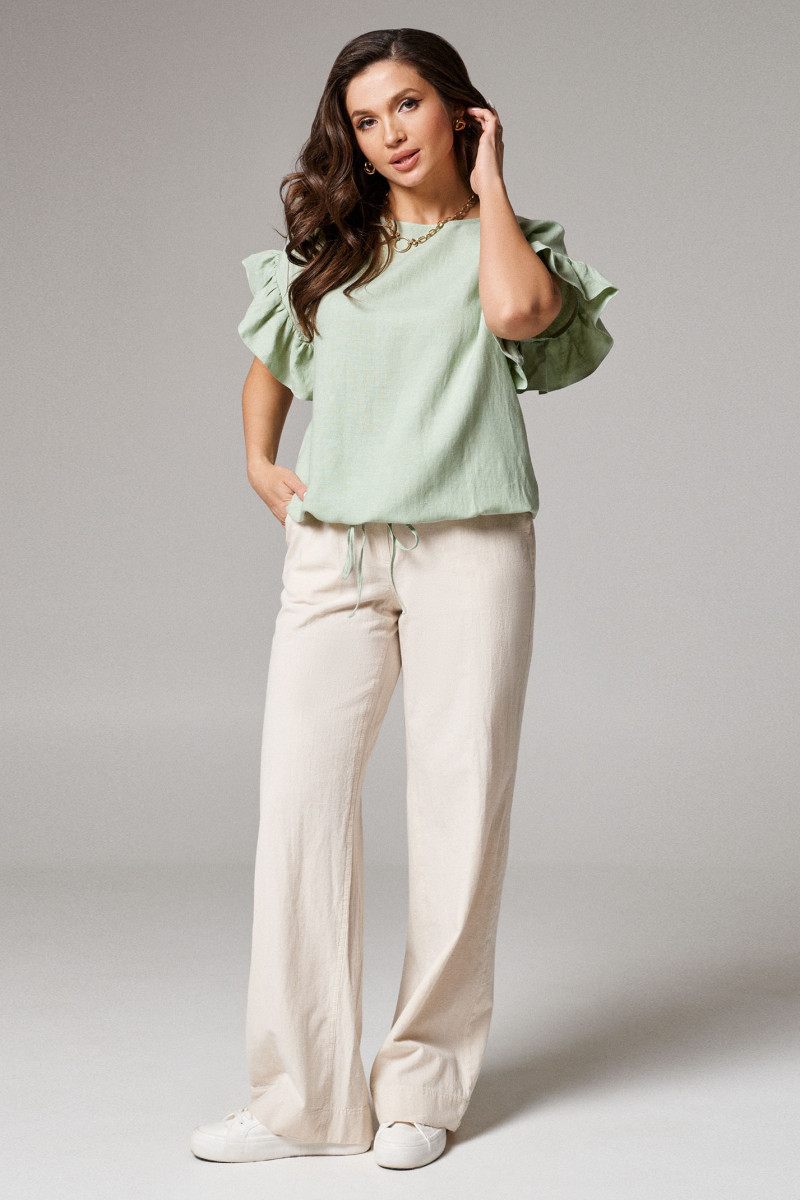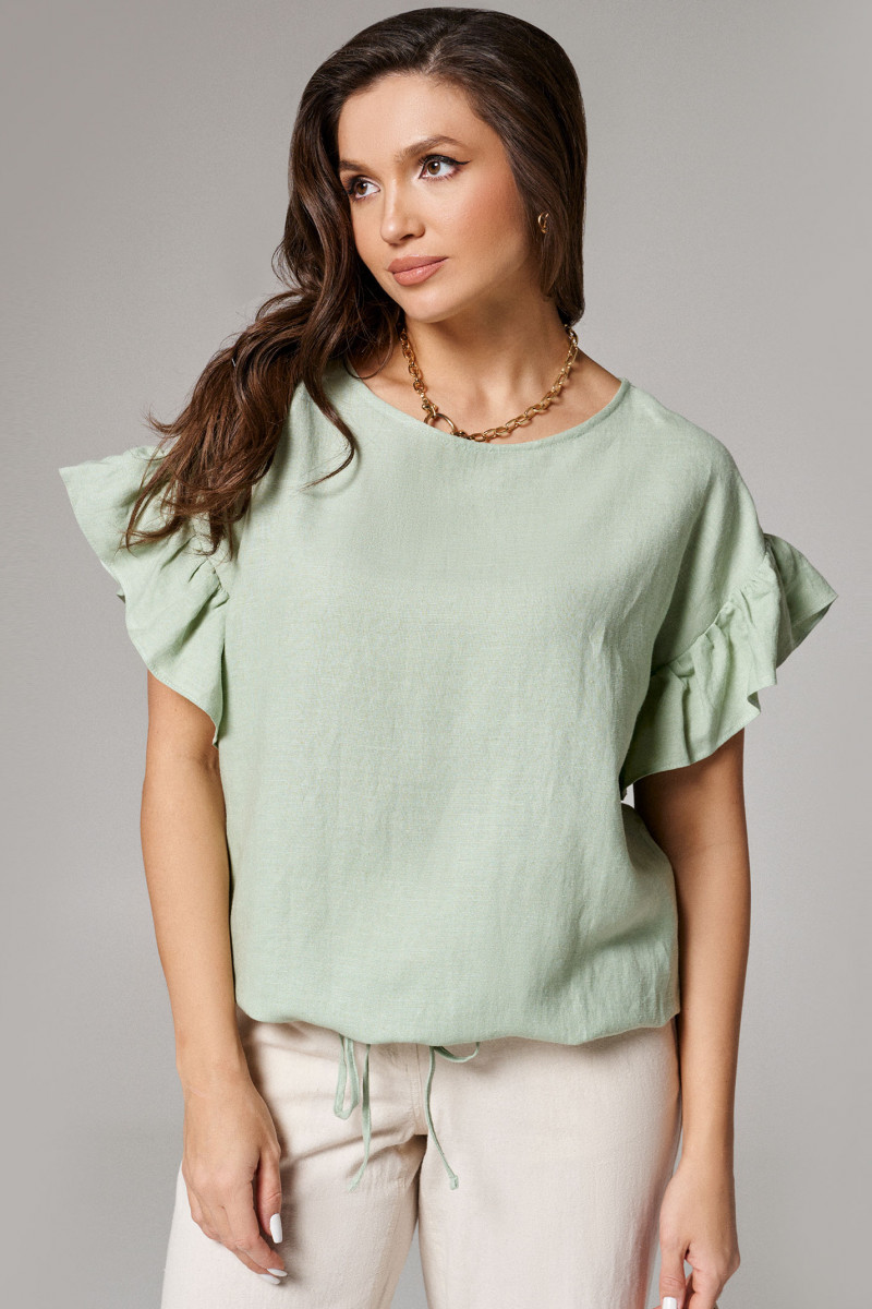 Блуза женская из льняной ткани для повседневной носки. Горловина круглая, пройма оформлена сборкой. По низу изделия кулиса.