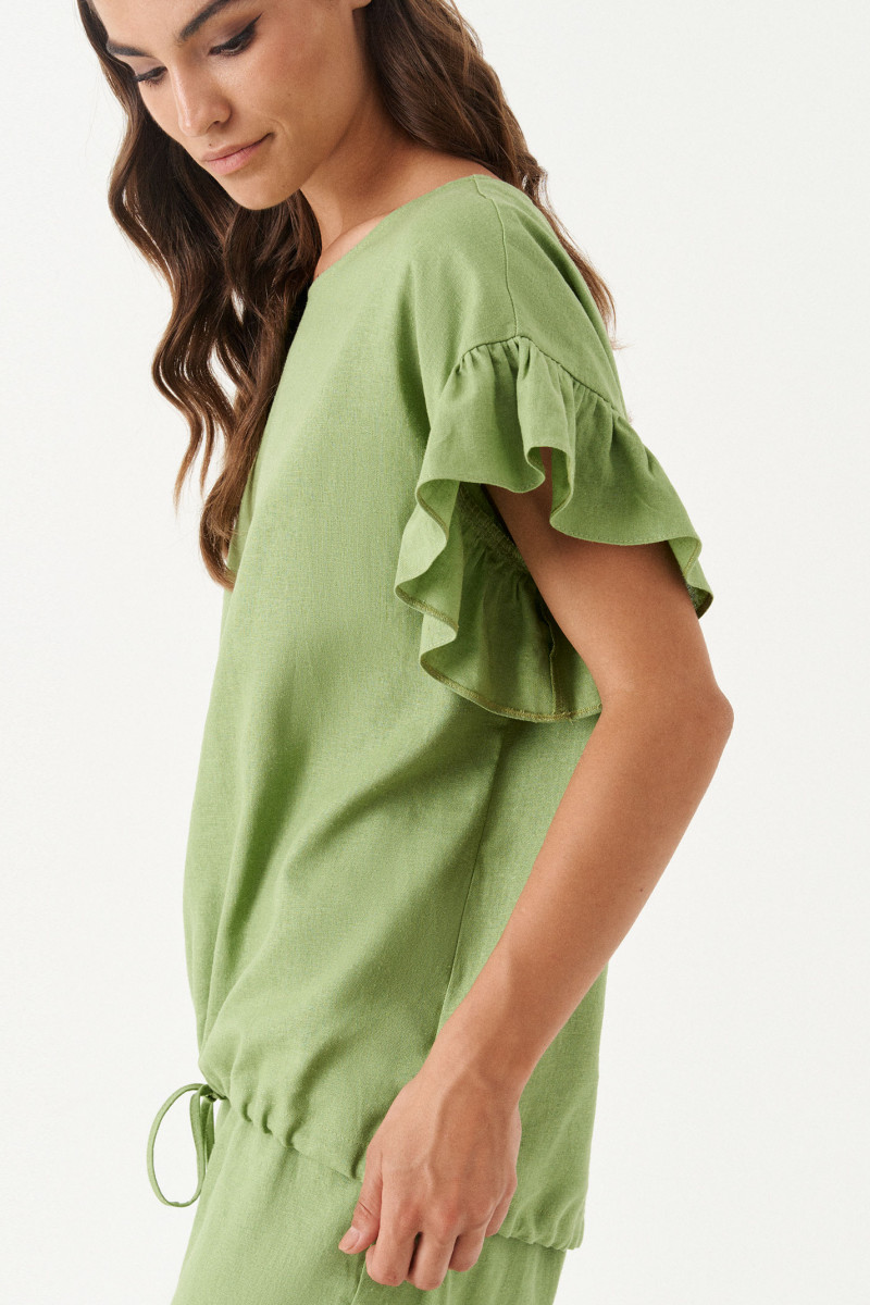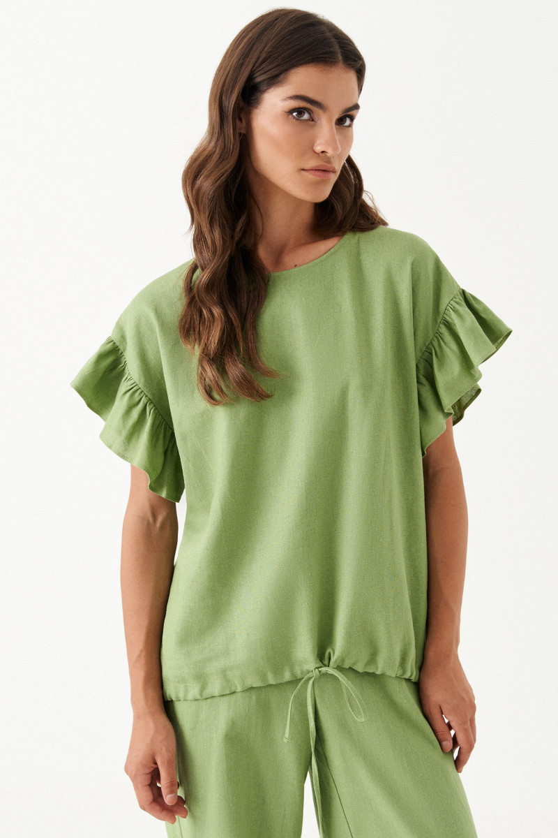 Блуза женская из льняной ткани для повседневной носки. Горловина круглая, пройма оформлена сборкой. По низу изделия кулиса.