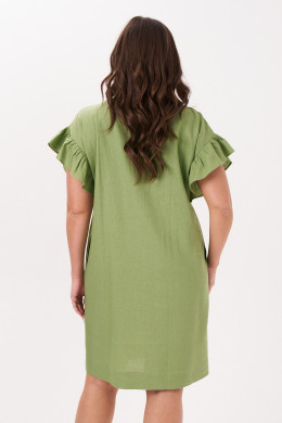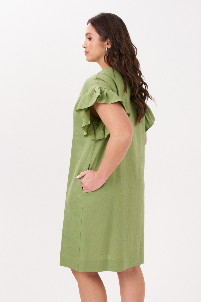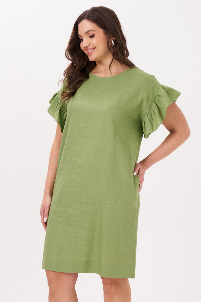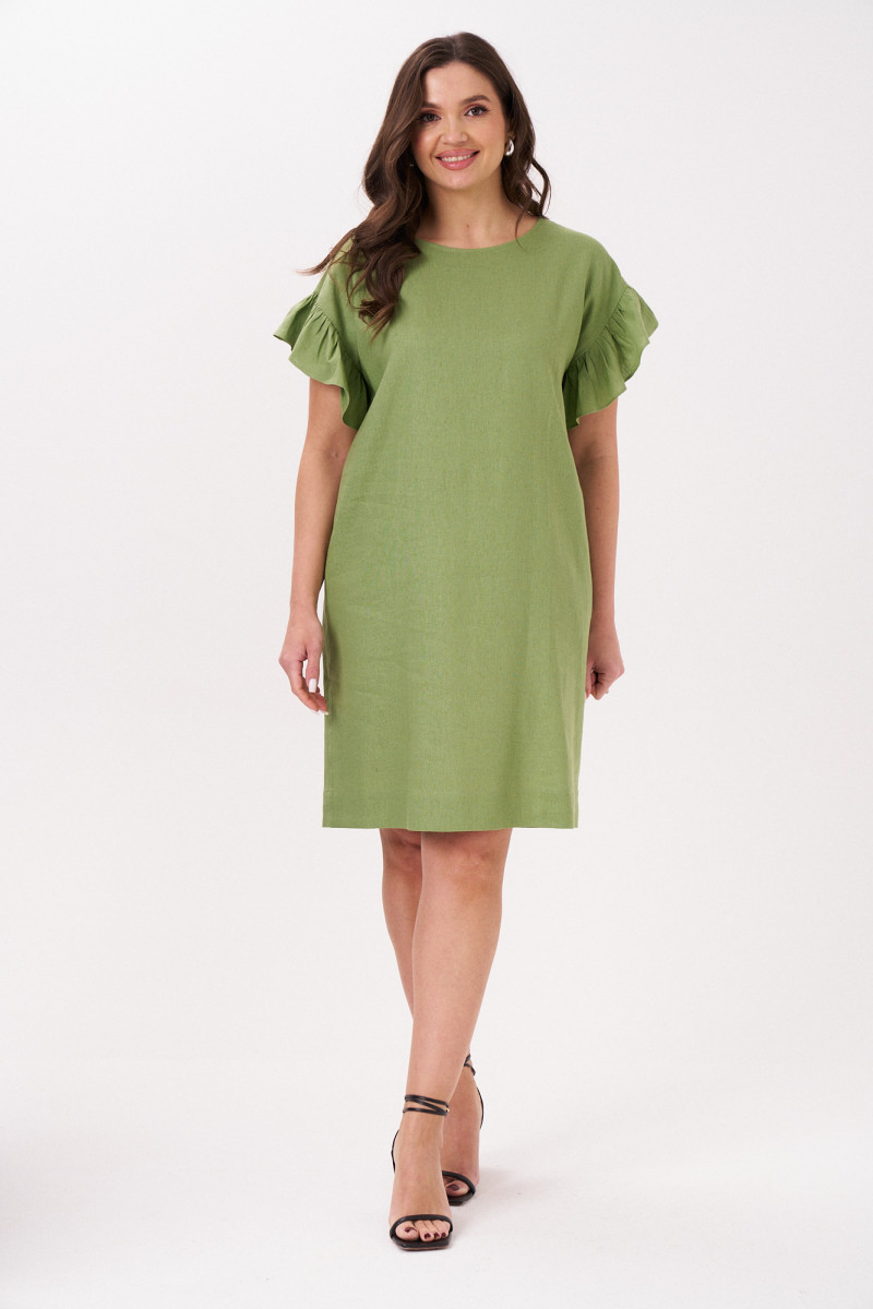 Платье женское из льняной ткани для повседневной носки. Платье прямое без подкладки с прорезными карманами в боковых швах. Горловина круглая, рукав короткий оформлен сборкой.
