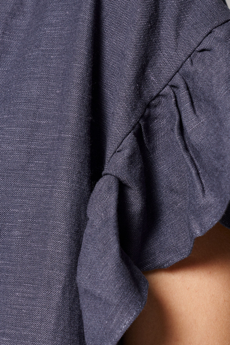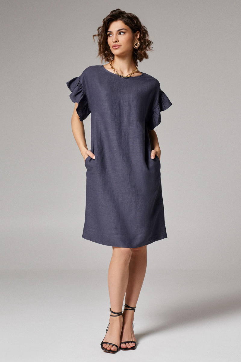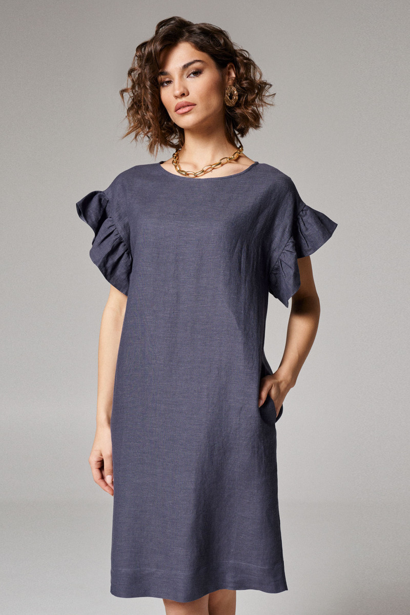 Платье женское из льняной ткани для повседневной носки. Платье прямое без подкладки с прорезными карманами в боковых швах. Горловина круглая, рукав короткий оформлен сборкой.