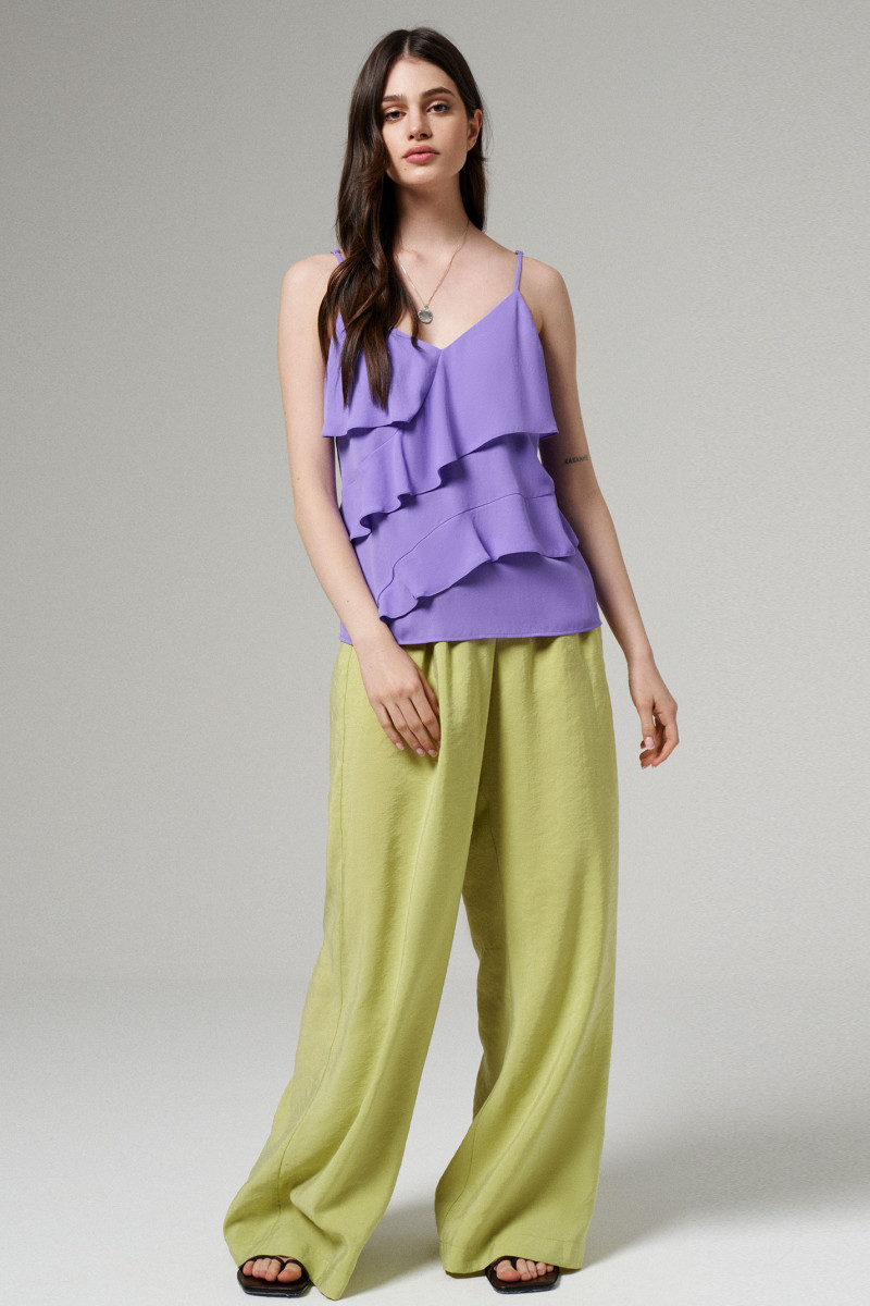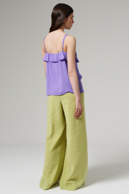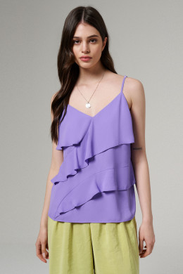 Блуза женская для повседневной носки из легкой струящейся ткани. Изделие полуприлегающего силуэта, на регулируемых бретелях. По переду отрезные воланы. Длина блузы классическая.