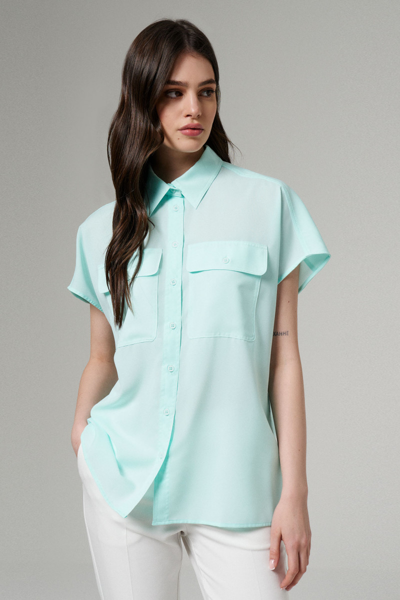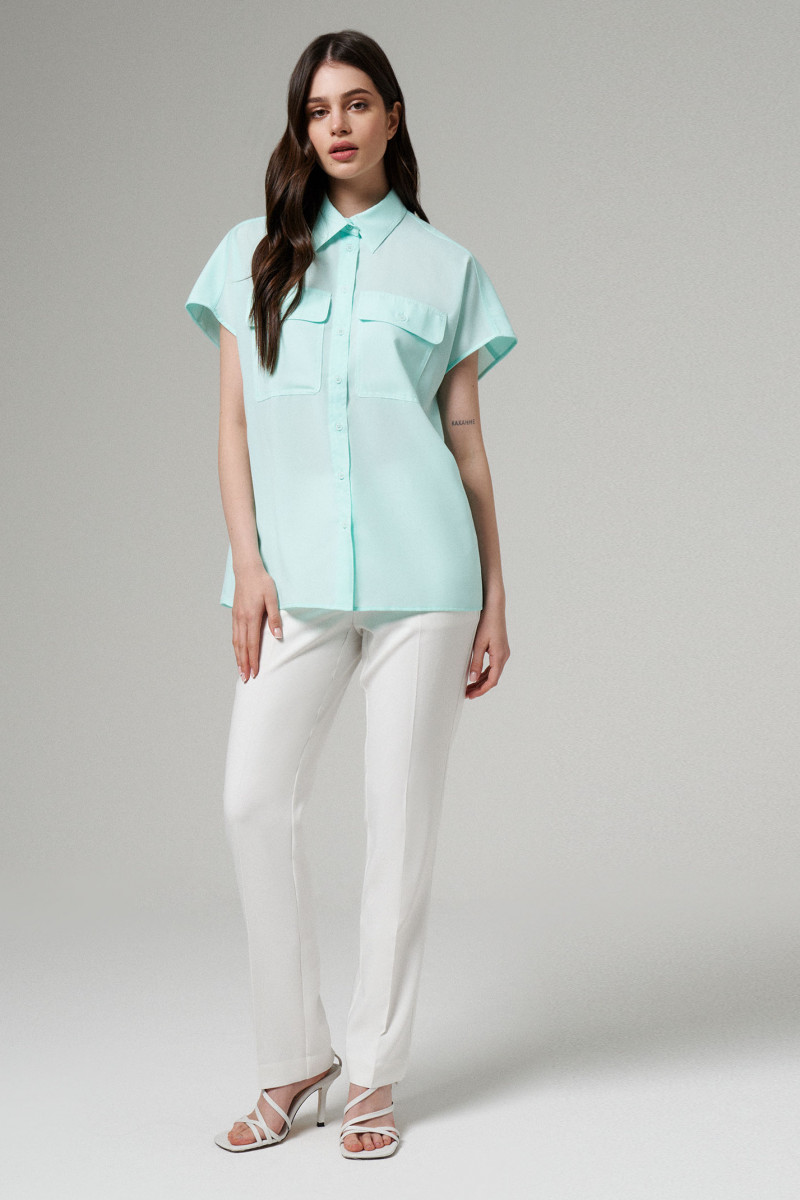 Блуза женская из лёгкой струящейся ткани для повседневной носки. Блуза прямого силуэта. Линия плеча спущенна, переходящая в рукав. Центральная застежка на петли-пуговицы. Горловина оформлена воротником- стойкой. Длина до середины бёдер, низ ровный.Эта модель идеально сочетается со светлыми брюками, что делает ее неотъемлемой частью вашего гардероба. Блузка также подойдет и для офиса, а также как нарядный элемент для вечерних мероприятий.