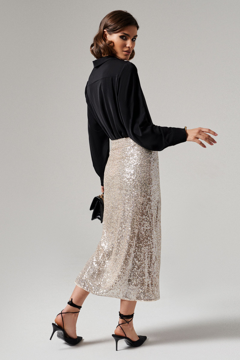 Юбка женская длинная из нарядной ткани с пайетками. Подкладка из полиэстра. Юбка прилегающего силуэта с высоким разрером по левой ноге. Застежка на потайную молнию в боковам шве. Юбка нарядная.