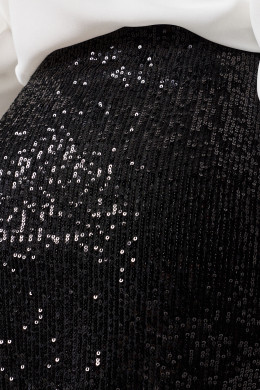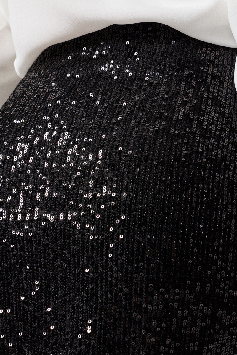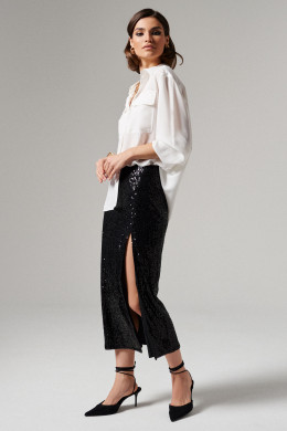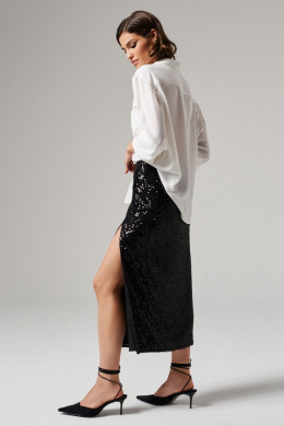 Юбка женская длинная из нарядной ткани с пайетками. Подкладка из полиэстра. Юбка прилегающего силуэта с высоким разрером по левой ноге. Застежка на потайную молнию в боковам шве. Юбка нарядная.