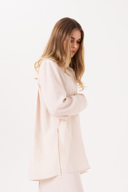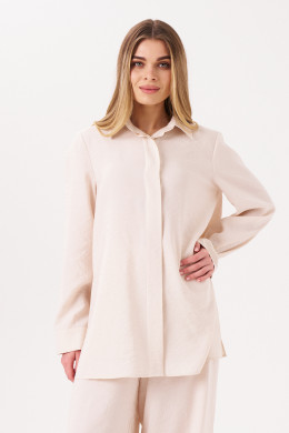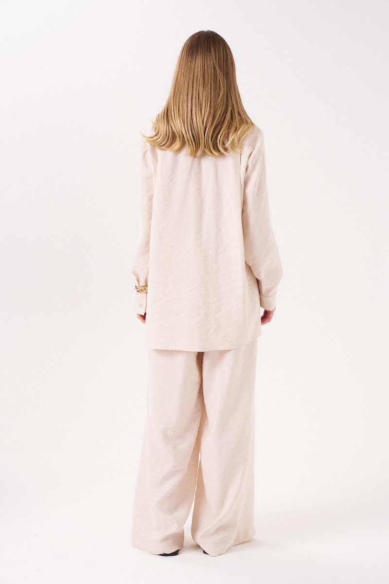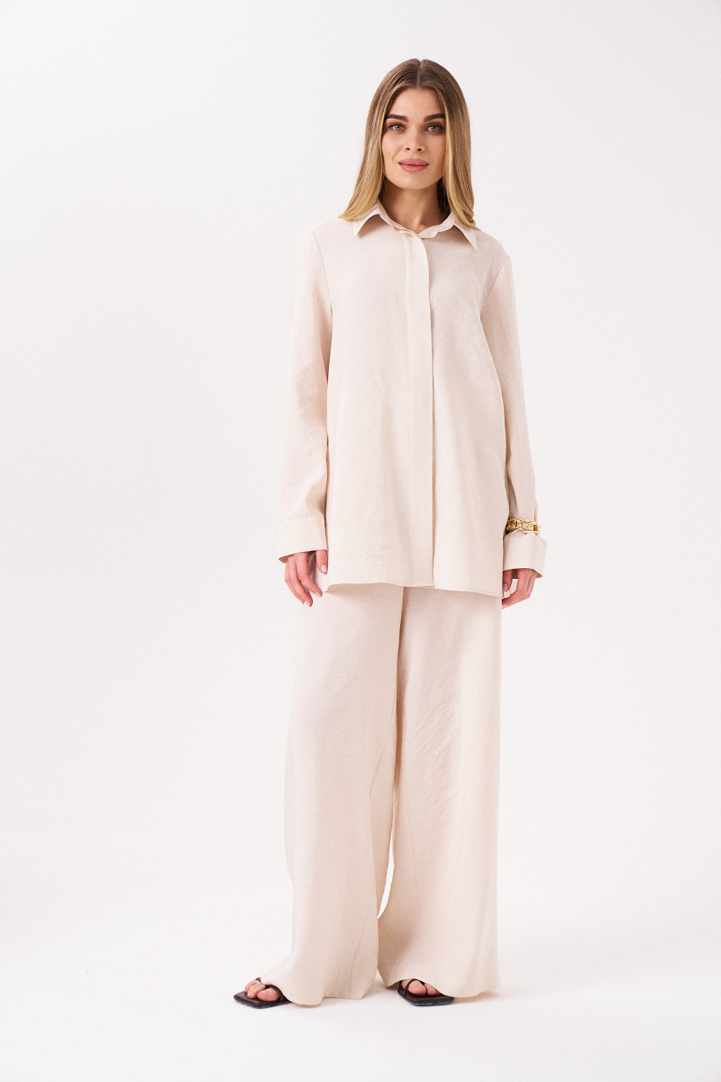 Комплект женский из смесовой ткани для повседневной носки. Костюм состоит из блузки и брюк. Блузка прямого силуэта. Застежка в блузке центральная бортовая на обметанные петли и пуговицы. Спинка с кокеткой и двумя складками. В боковых швах имеются разрезы. Горловина обработана рубашечным воротником с отрезной стойкой. Рукава втачные длинные, низ рукава обработан притачной манжетой с застежкой на одну обметанную петлю и одну пуговицу. Брюки прямые. Верхний срез брюк обработан притачным поясом со вставкой на резинке в задней части брюк. Задняя часть брюк имеет две талиевые вытачки. В боковом шве располагается карман с подкройным бочком, а также потайная застежка-молния. Стильный комплект в элегантном бежевом цвете, который обязательно осчастливит вас своим фасоном и чудесной посадкой. Данный комплект можно носить по отдельности создавая для себя новые образы.