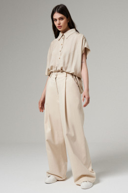 Брюки женские типа джинс. Брюки прямые, широкие, с отрезным поясом на петлю пуговицу, застежка на тесьму- молнию, по поясу есть шлёвки. По переду от пояса заложены складки, а также в боковых швах два кармана. На задних частях брюк вытачки от пояса и два настрочных кармана фигурной формы. Создать стильный, свободный образ помогут хлопковые брюки. Брюки удачно сочетаются со спортивной обувью и лоферами.