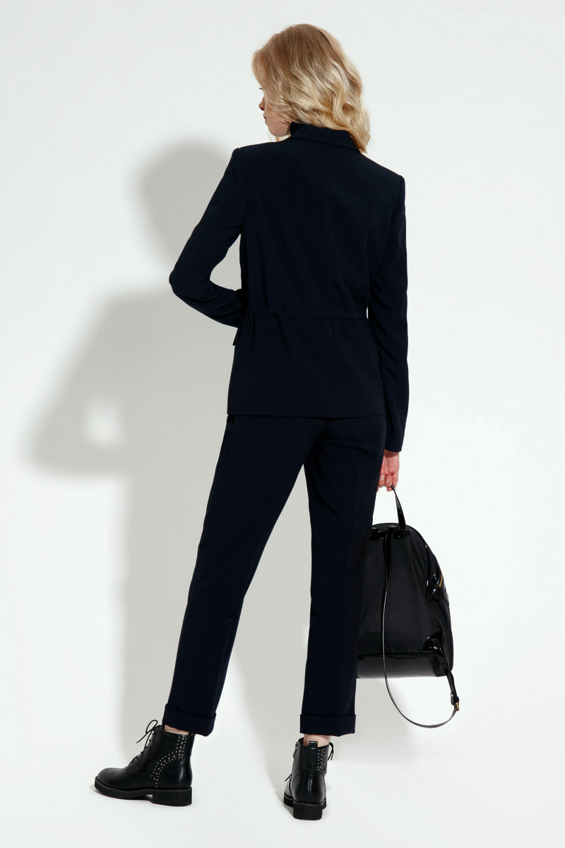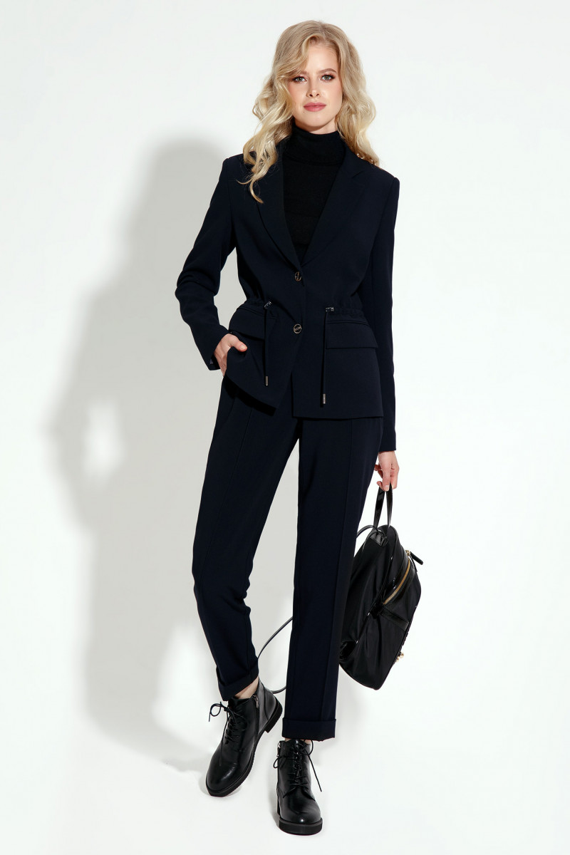 Современный костюм офисный женский составляют приталенный жакет с V-вырезом и отложным воротником, а также брюки с поясом на резинке и стрелками. Однобортный пиджак с кулисой подчеркивает талию, застегивается на пуговицы, имеет прорезные карманы с клапанами.