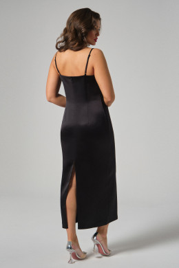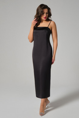 Платье женское прилегающего силуэта на бретелях. Брители регулируются. Длина платья до середины голени. Средний шов спинки заканчивается шлицей. Застегивается на потайную молнию в среднем шве спинки.