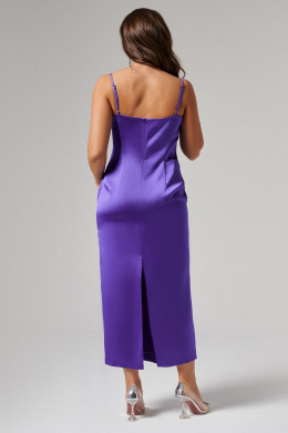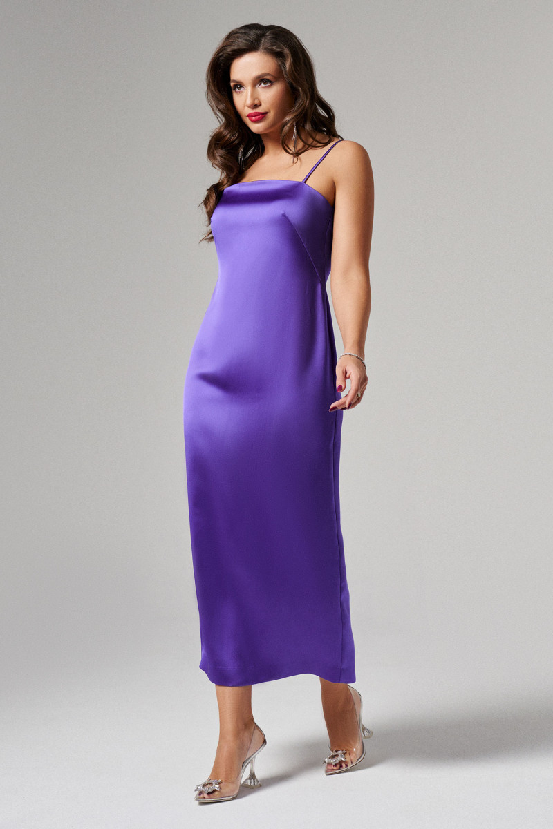 Платье женское прилегающего силуэта на бретелях. Брители регулируются. Длина платья до середины голени. Средний шов спинки заканчивается шлицей. Застегивается на потайную молнию в среднем шве спинки.