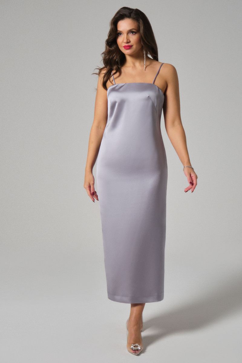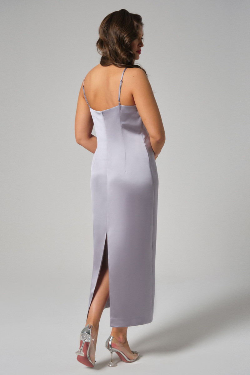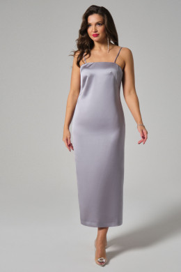 Платье женское прилегающего силуэта на бретелях. Брители регулируются. Длина платья до середины голени. Средний шов спинки заканчивается шлицей. Застегивается на потайную молнию в среднем шве спинки.