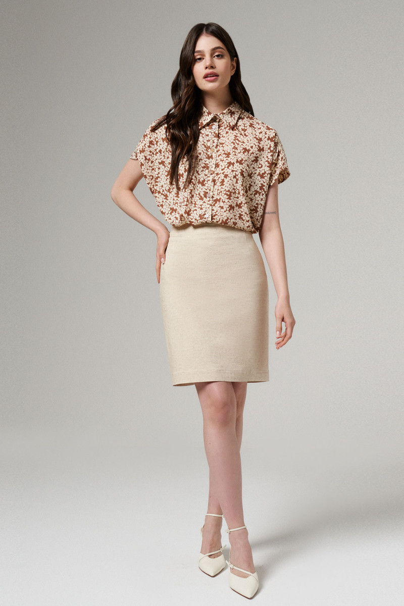 Юбка женская на поясе полуприлегающего силуэта из вискозной ткани для повседневной носки. Изделие на хлопковой подкладке длиной до середины бедра. На переднем поллотнище юбки талиевые вытачки. На заднем полотнище молния в среднем шве и талиевые вытачки.