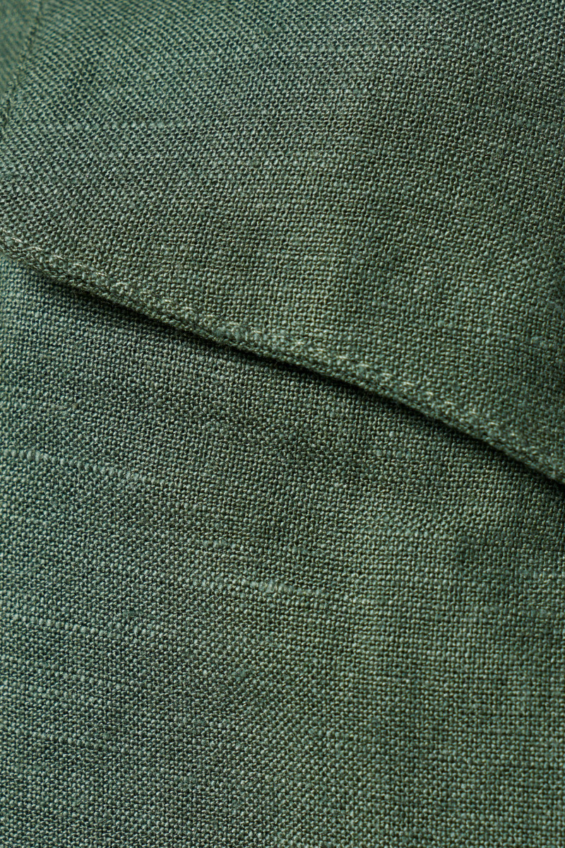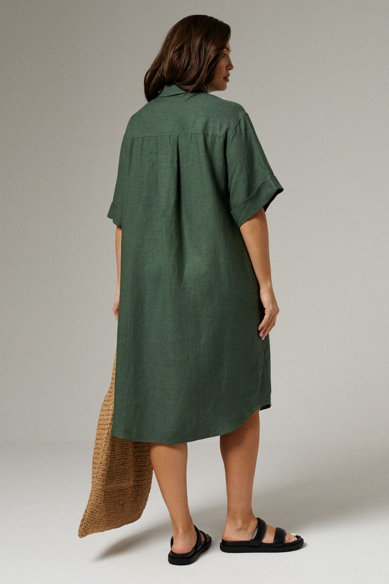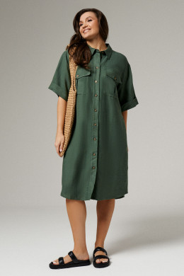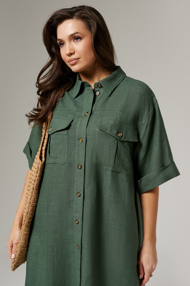 Платье женское из льняной ткани для повседневной носки. Платье прямого силуэта с фронтальной застежкой на пуговицы и воротником--стойкой. Рукав втачной укороченный оформлен притачной отложной манжетой. По переду отрезная кокетка, накладные карманы с клапаном, застёгивающиеся на петлю-пуговицу. Спинка с отрезной кокеткой и бантовой складкой. В боковых швах треугольная вставка. Низ фигурный. Стильное платье для тёплых дней.