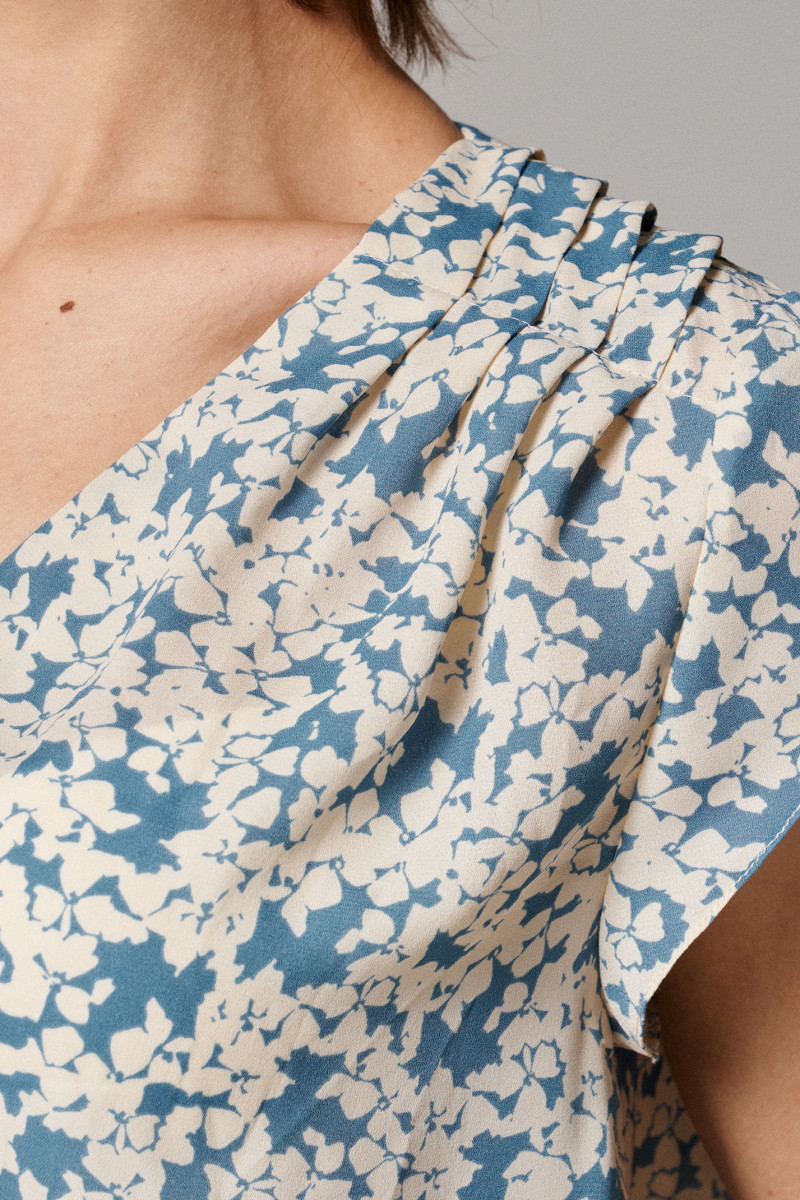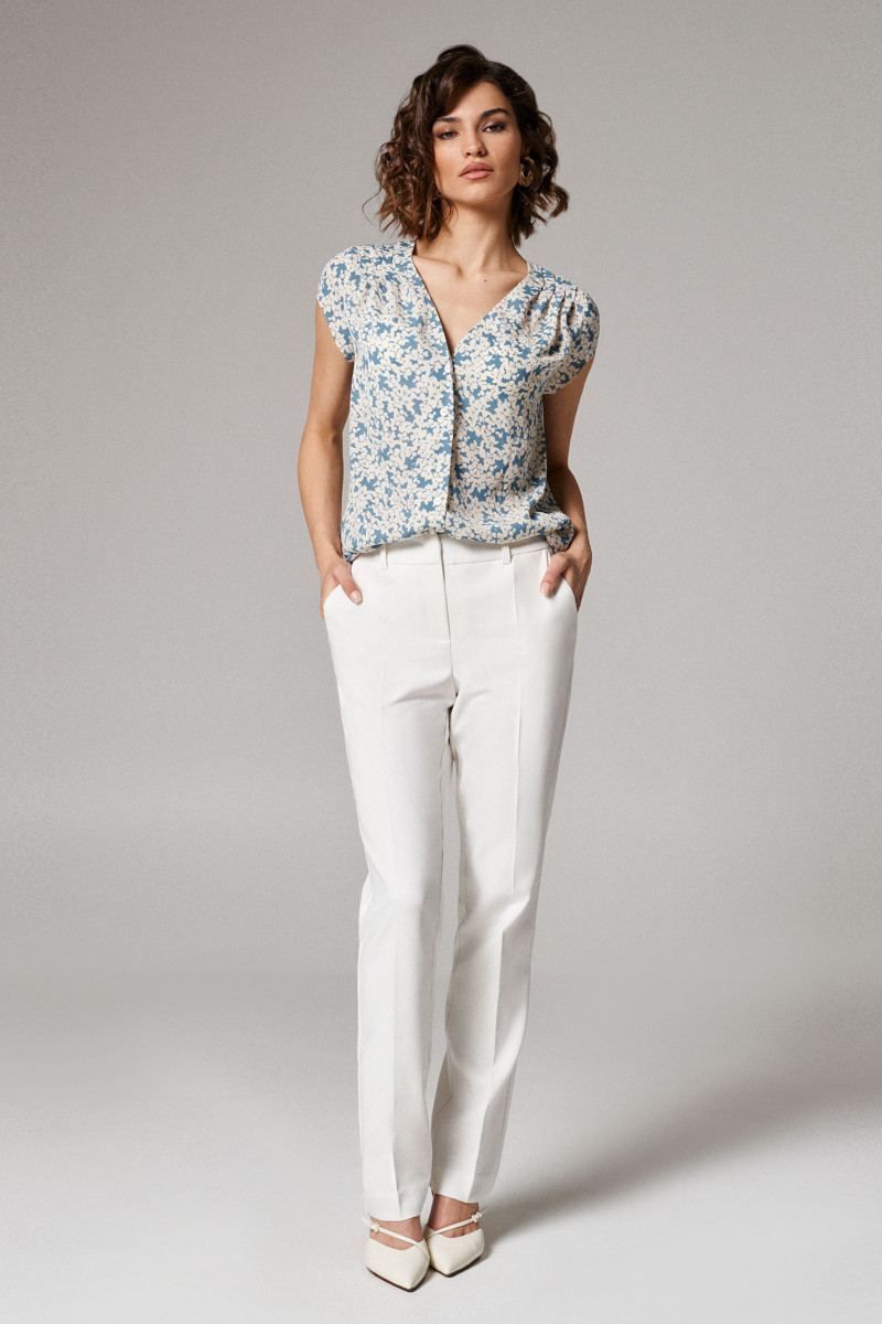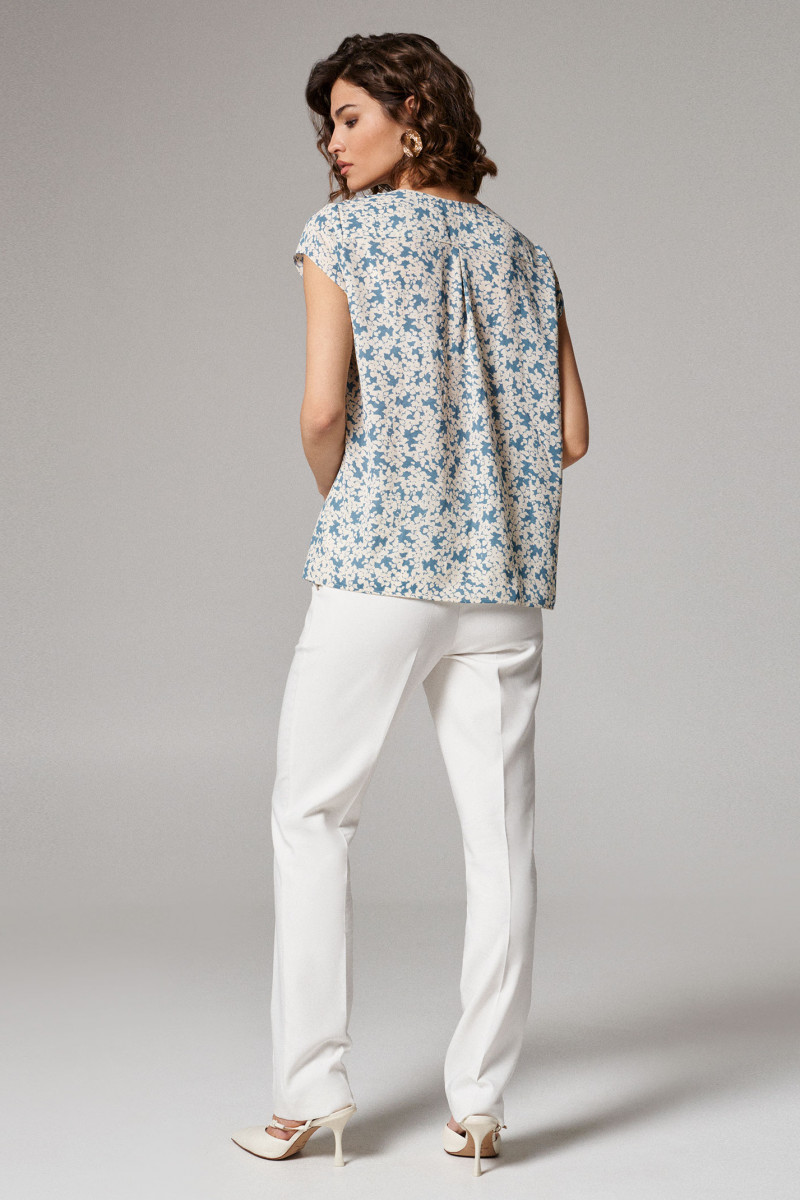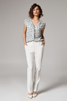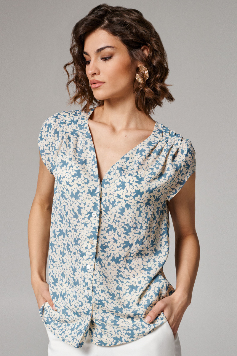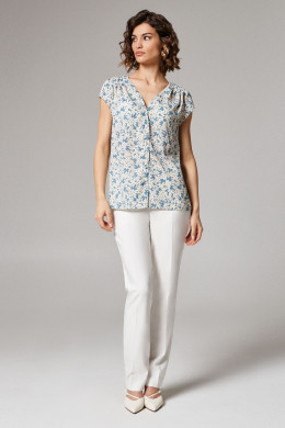 Блуза женская из струящейся лёгкой ткани для повседневной носки. Изделие прямого силуэта с коротким втачным рукавом. Горловина изделия V-образная, фронтальная застежка на пуговицы. По переду защипы-складки из плечевых швов. Длина блузы классическая. Данная блузка отлично сочетается со светлыми брюками, идеальный вариант для летнего гардероба.
