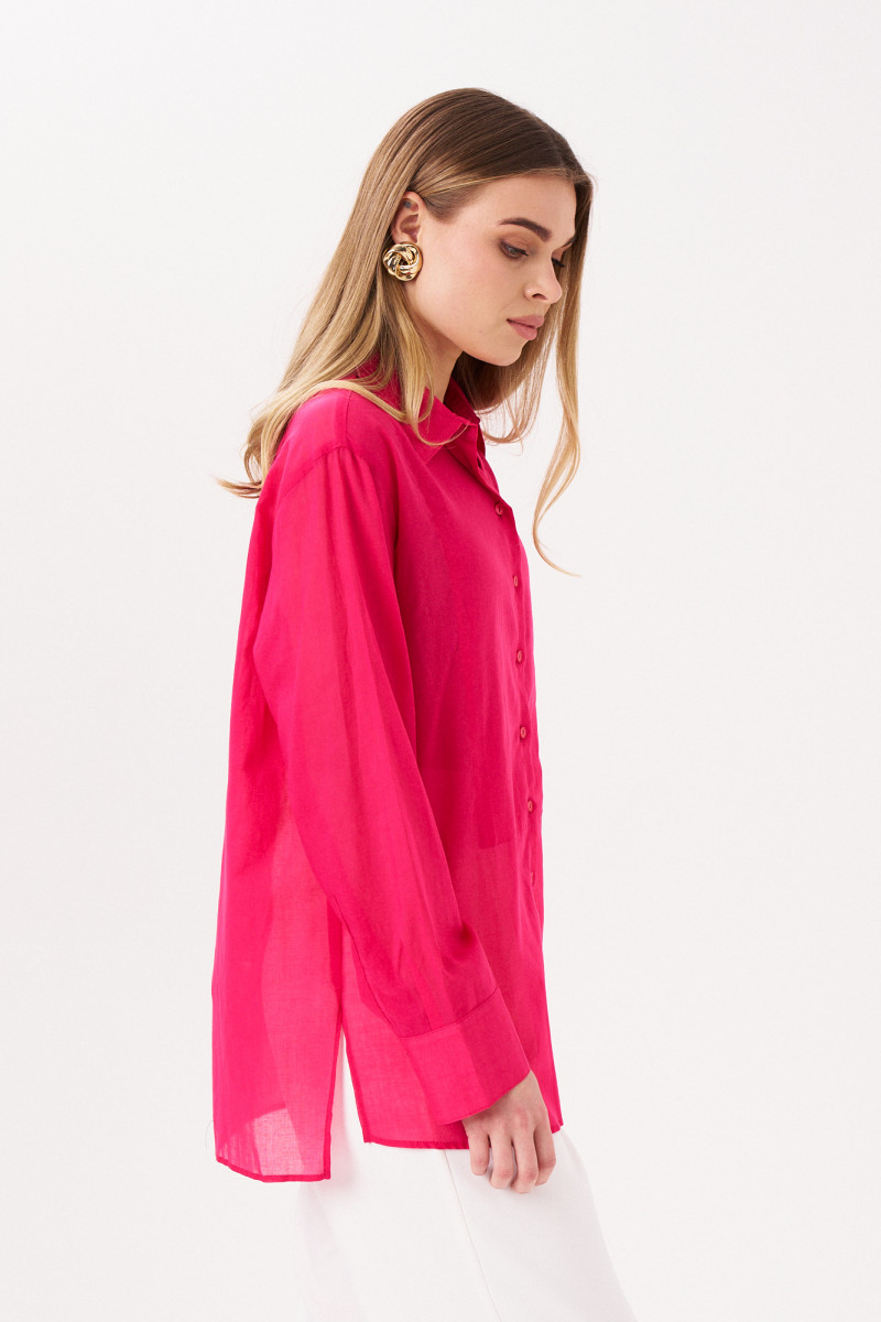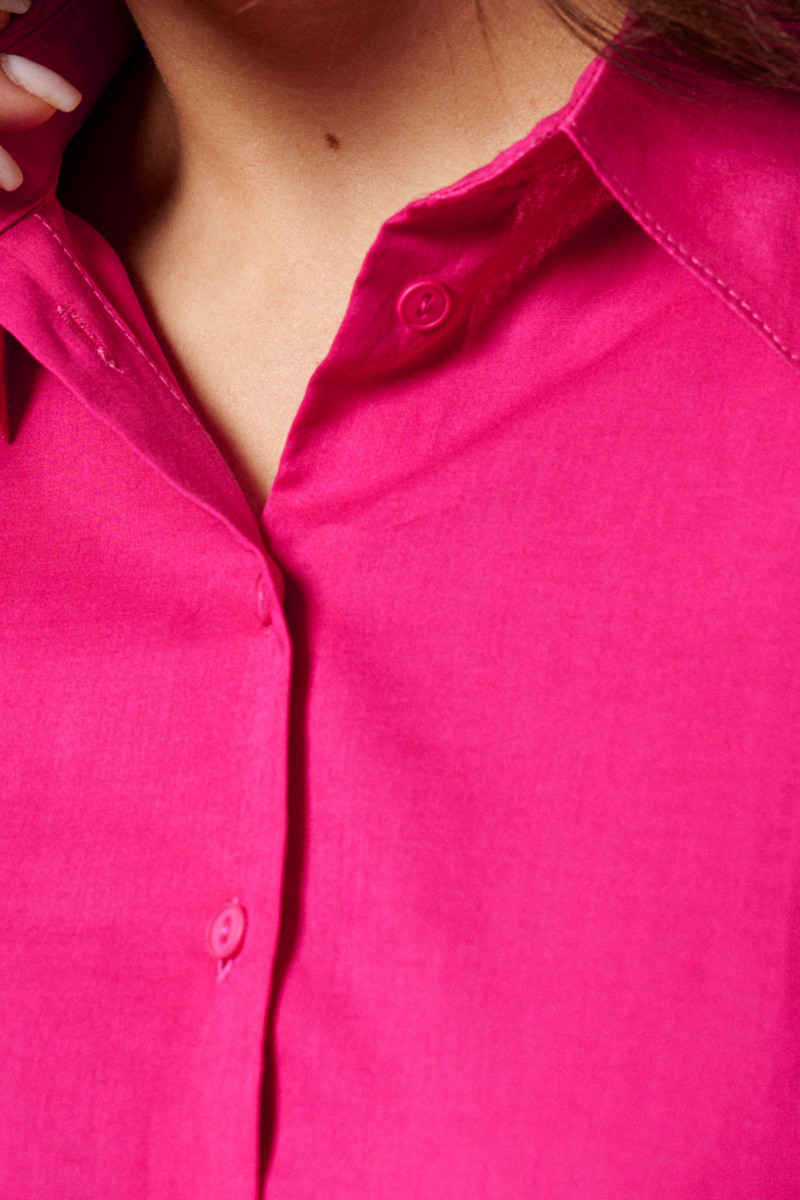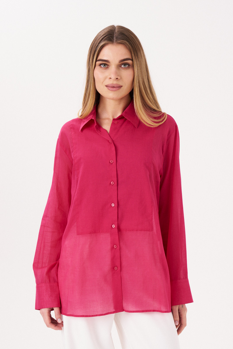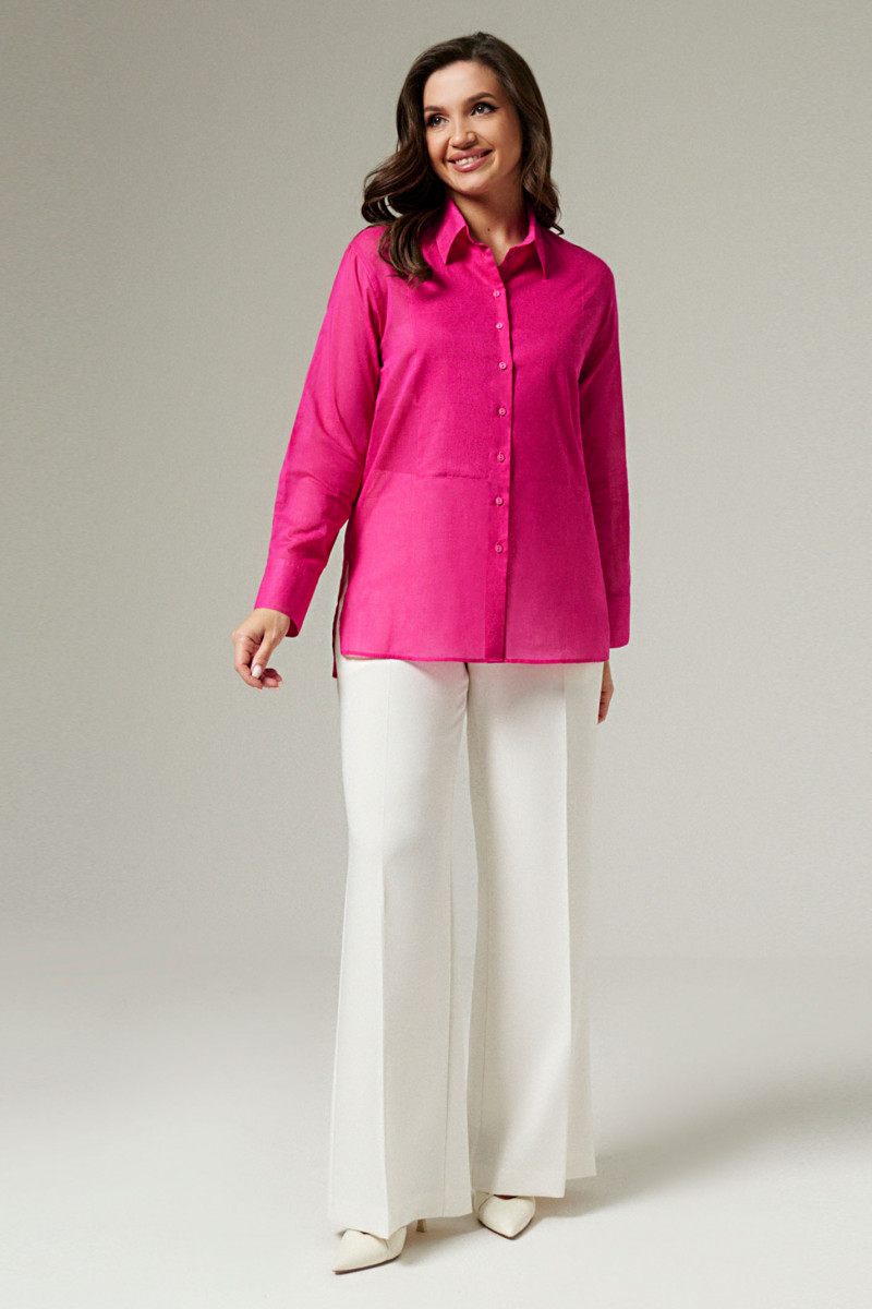 Блуза из хлопковой ткани для повседневной носки. Изделие прямого кроя с фронтальной застежкой по переду, настрочной деталью по груди. Рукав длинный втачной, оформлен притачной манжетой, застегивающейся на пуговицы. Блуза классической длины с разрезами в боковых швах от низа.