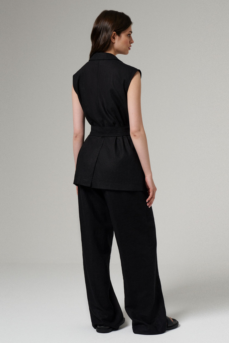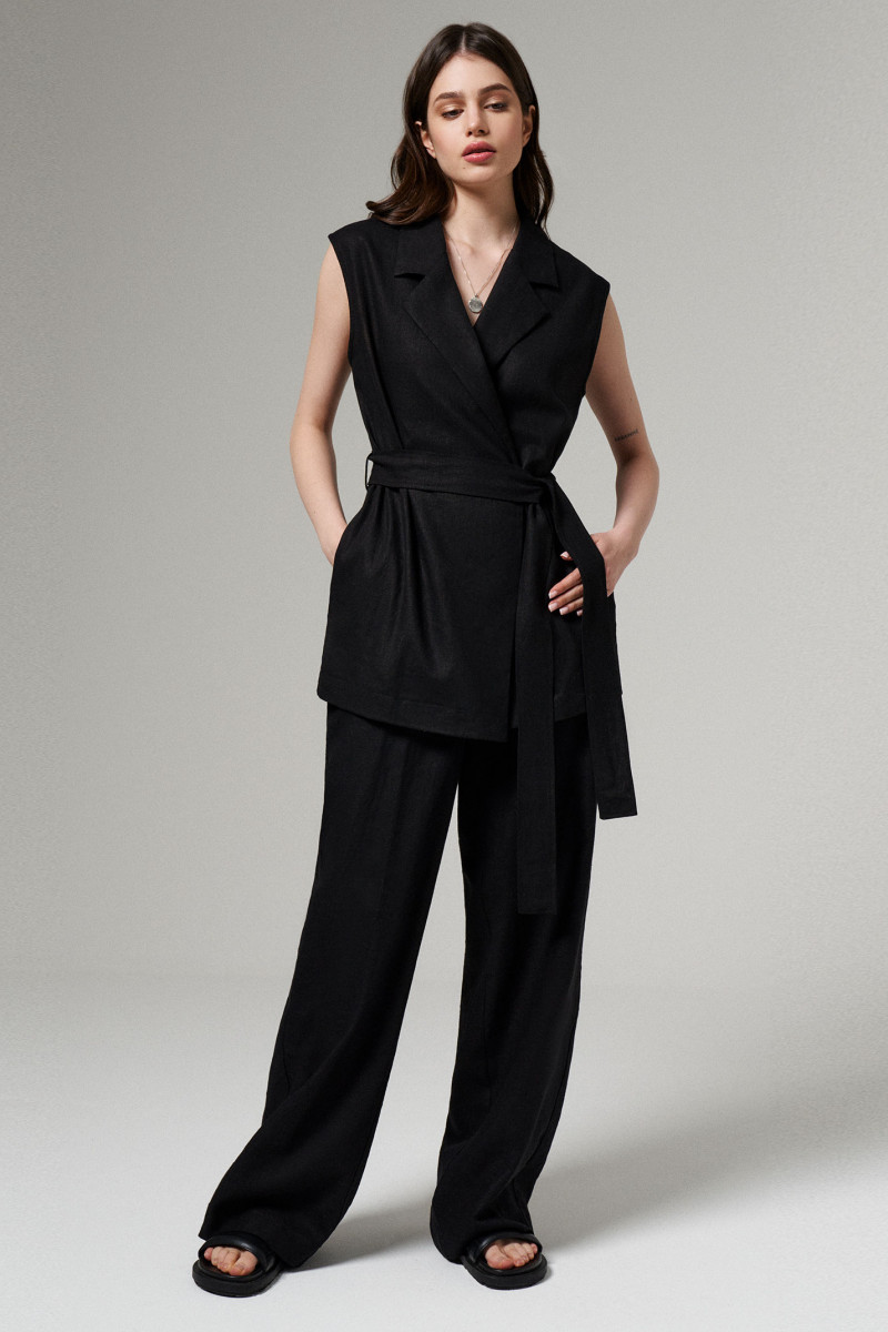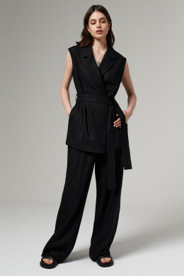 Жилет женский из вискозной ткани для повседневной носки. Изделиепрямого кроя без рукавов с отложным воротником. В боковых швах прорезные карманы. Жилет укомплектованопоясом из основной ткани изделия. Длина жилета классическая.