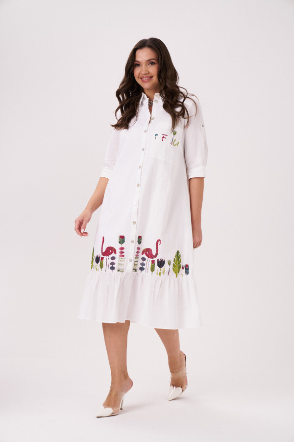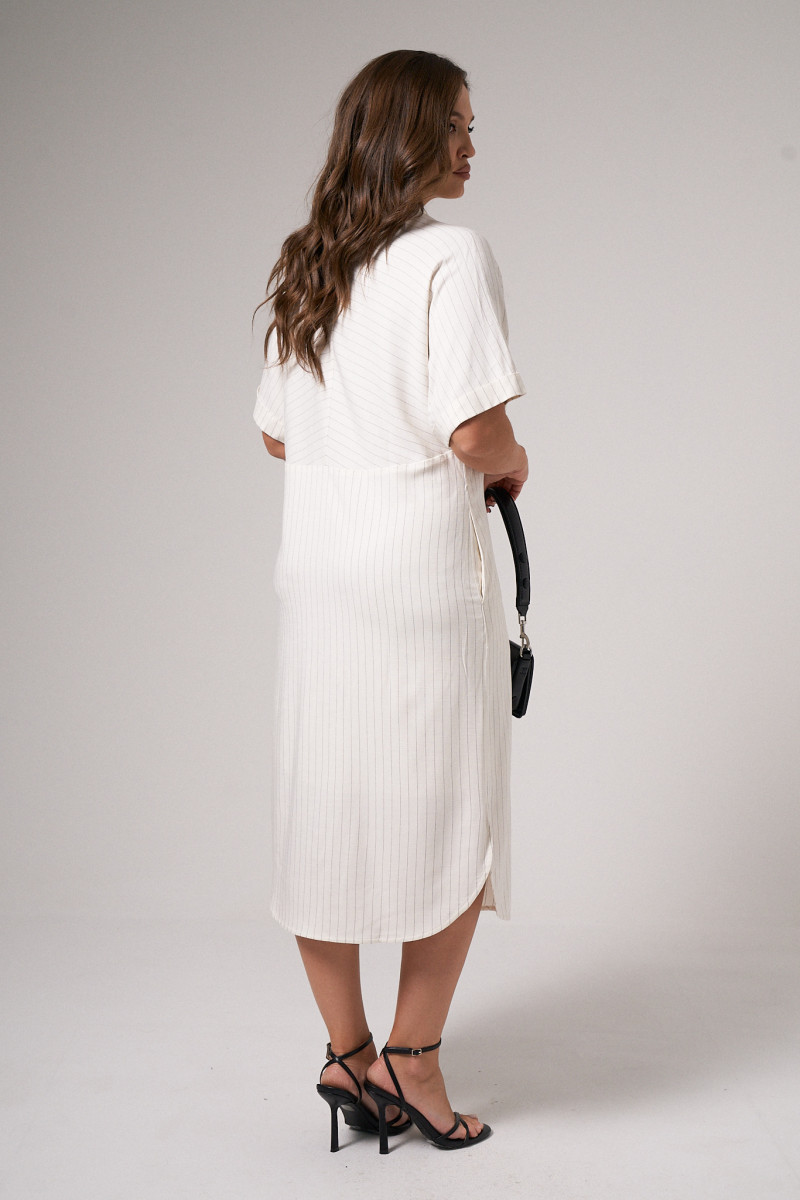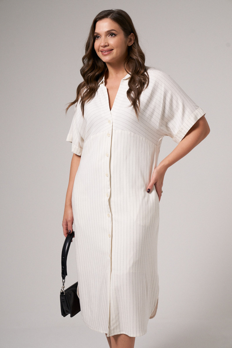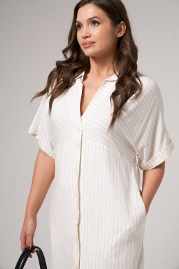Платье из вискозной ткани для повседневной носки. Изделие на вискозной подкладке. Платье с подрезом под грудью, цельнокроеным коротким рукавом, оформленным притачной отложной манжетой. Воротник- стойка. Изделие с фронтальной застежкой на пуговицы, прямого силуэта, длиной до колена. В боковых швах прорезные карманы, разрезы от низа изделия.