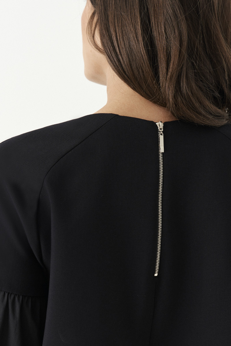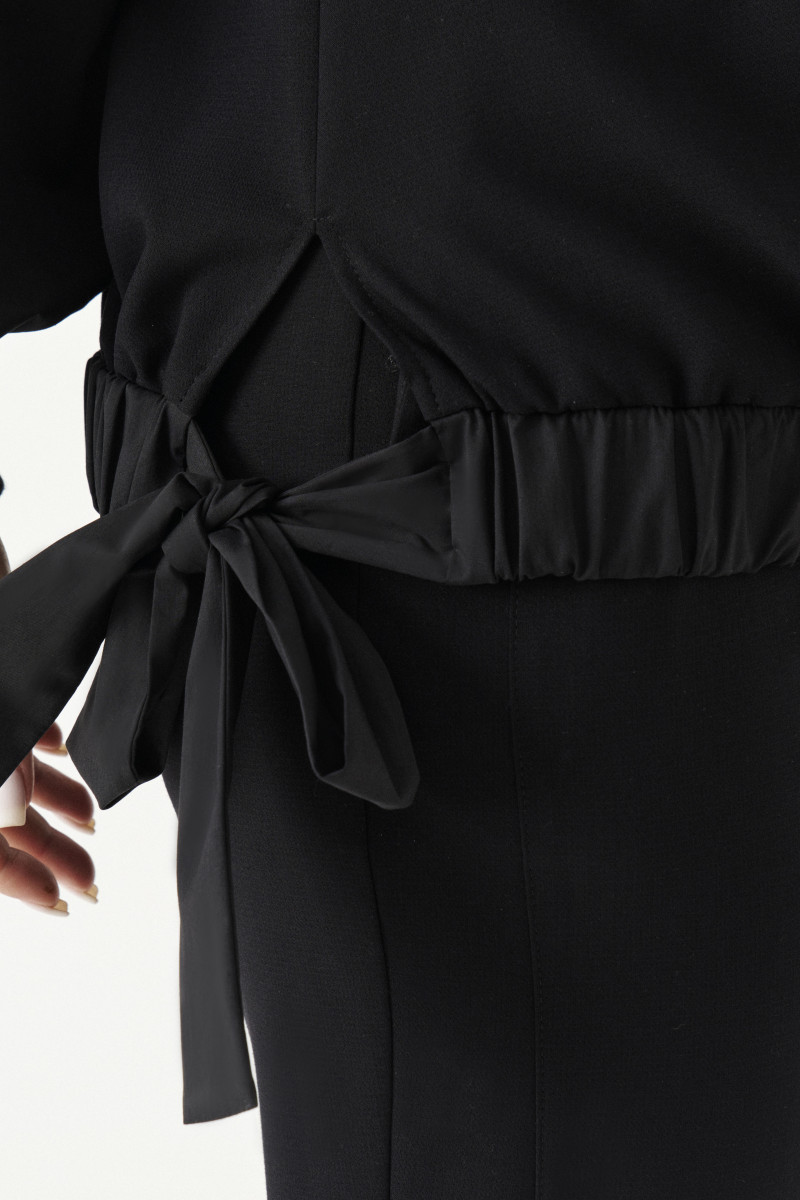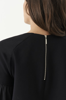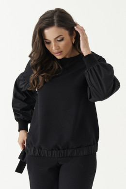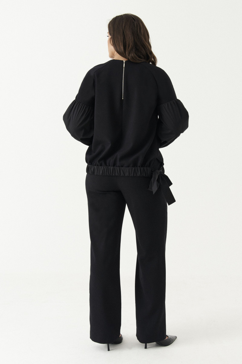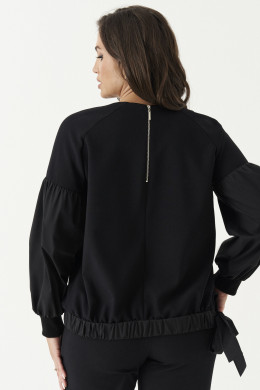 Блузка женская из смесовой ткани для повседневной носки прямого силуэта. Спинка с средним швом, застежка-молния располагается в среднем шве спинки. По низу блузки имеется притачной пояс на резинке. Горловина расширенная. Рукав реглан, низ рукава обработан манжетой на резинке. В боковом шве имеется завязка на ленту. Даная блузка станет отличным вариантом для разных прогулок, а также для любимого времяпровождения.