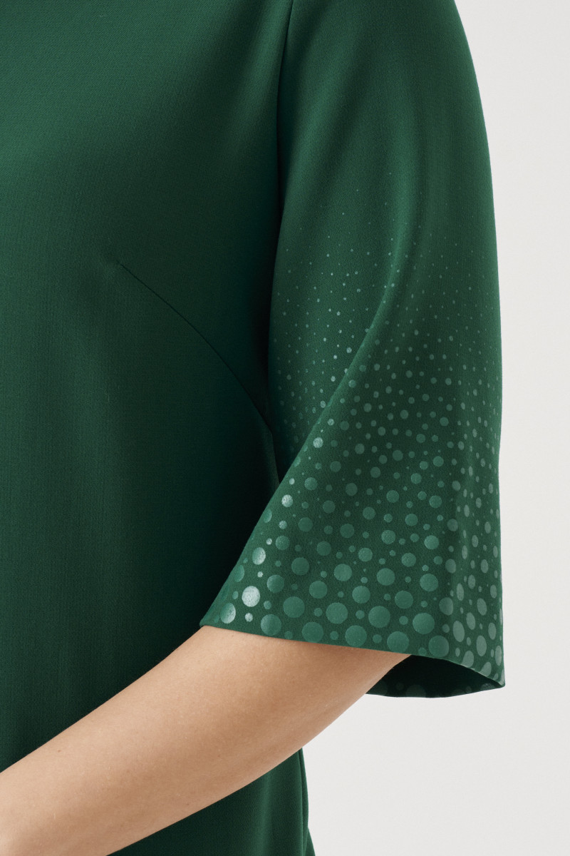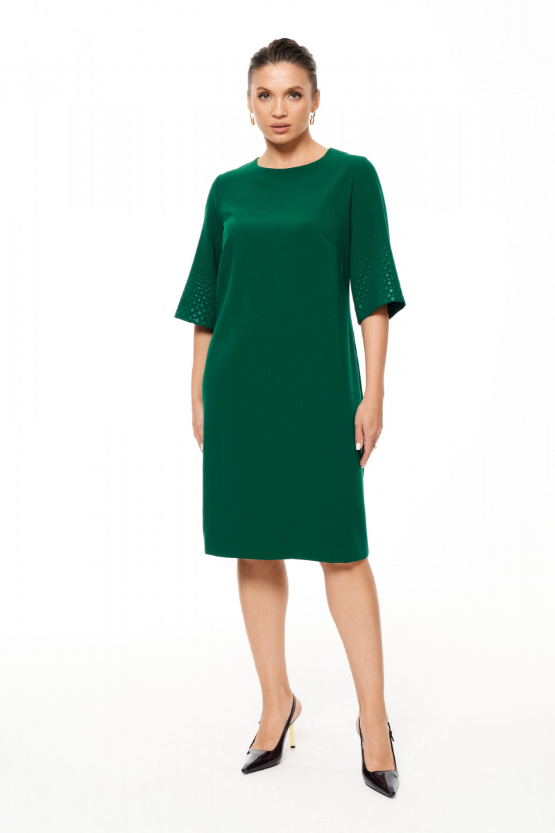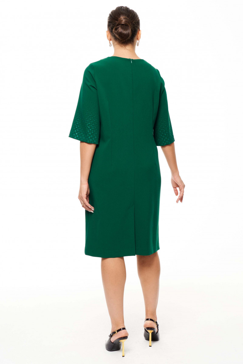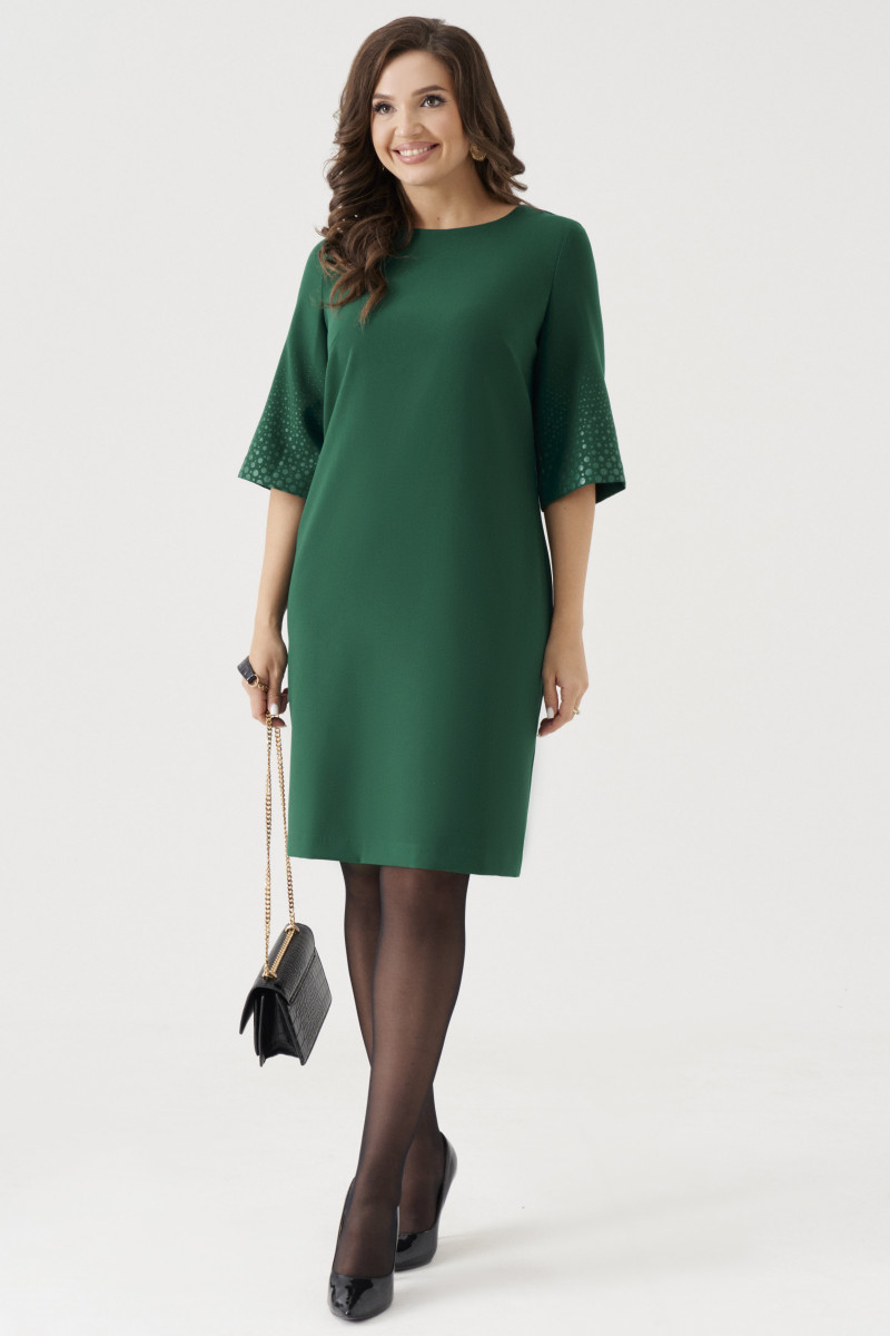 Платье женское из смесовой ткани для повседневной носки полуприлегающего силуэта. Перед имеет две нагрудные вытачки. Спинка с средним швом и потайной застежкой в шве. Горловина обработана обтачкой. Рукава чуть ниже локтя, по низу рукава имеется печать. Обворожительное платье сможет подчеркнуть всю красоту вашей фигуры и придаст вам легкости и элегантности.
