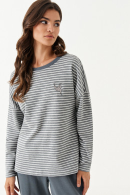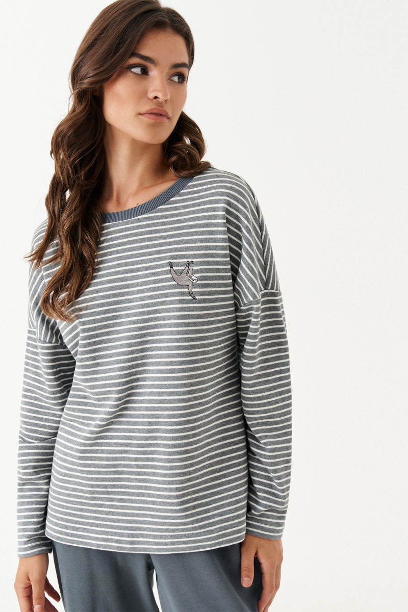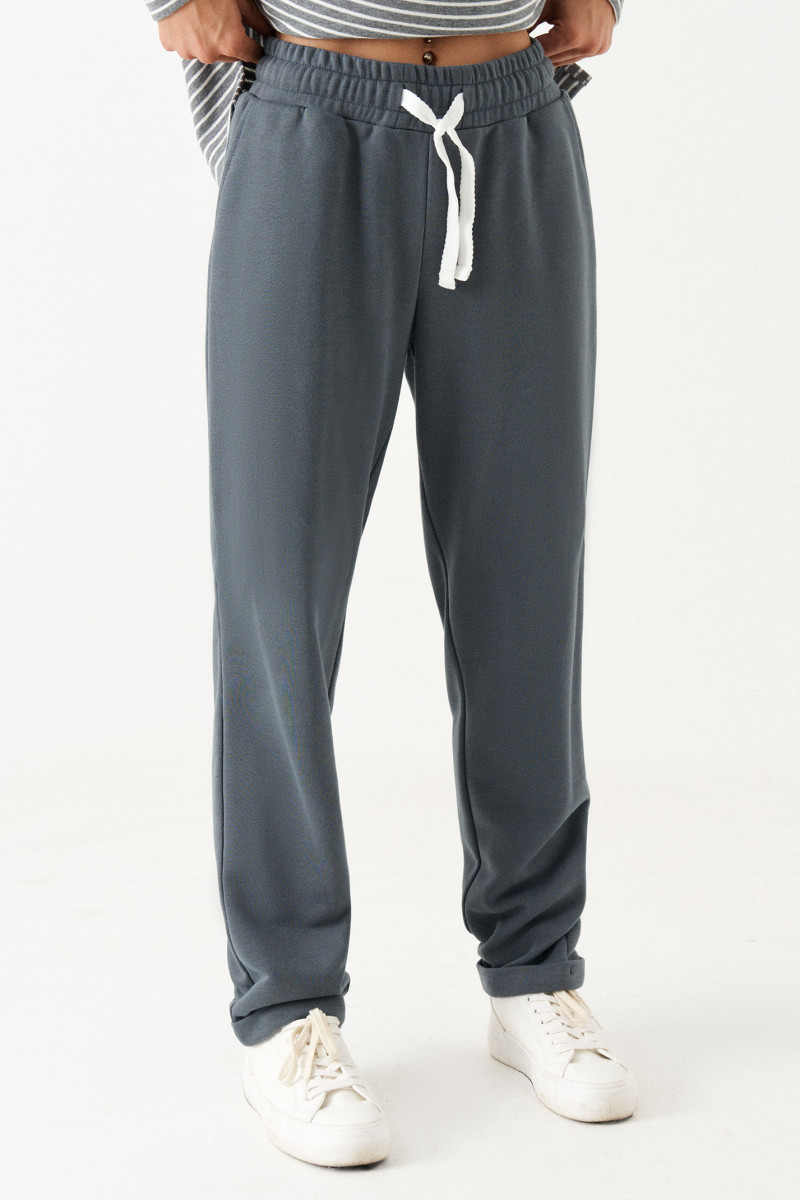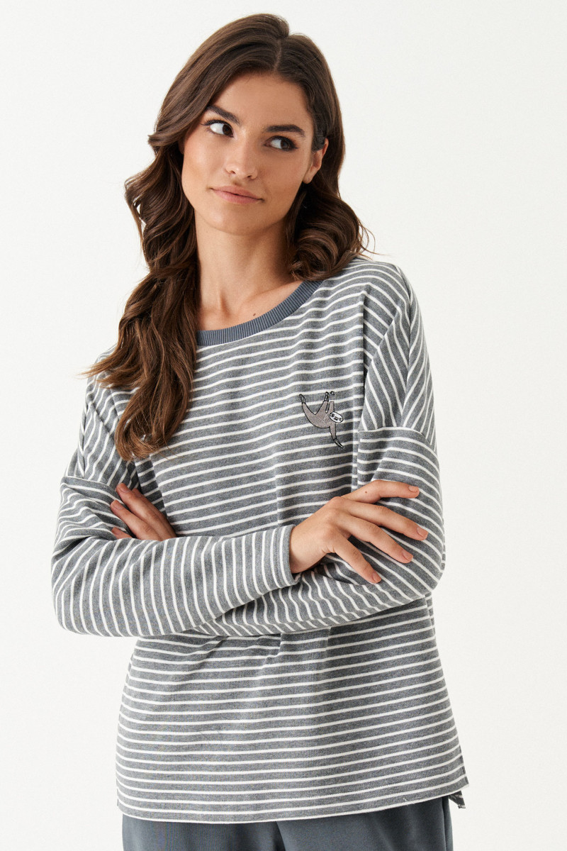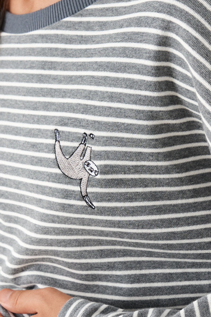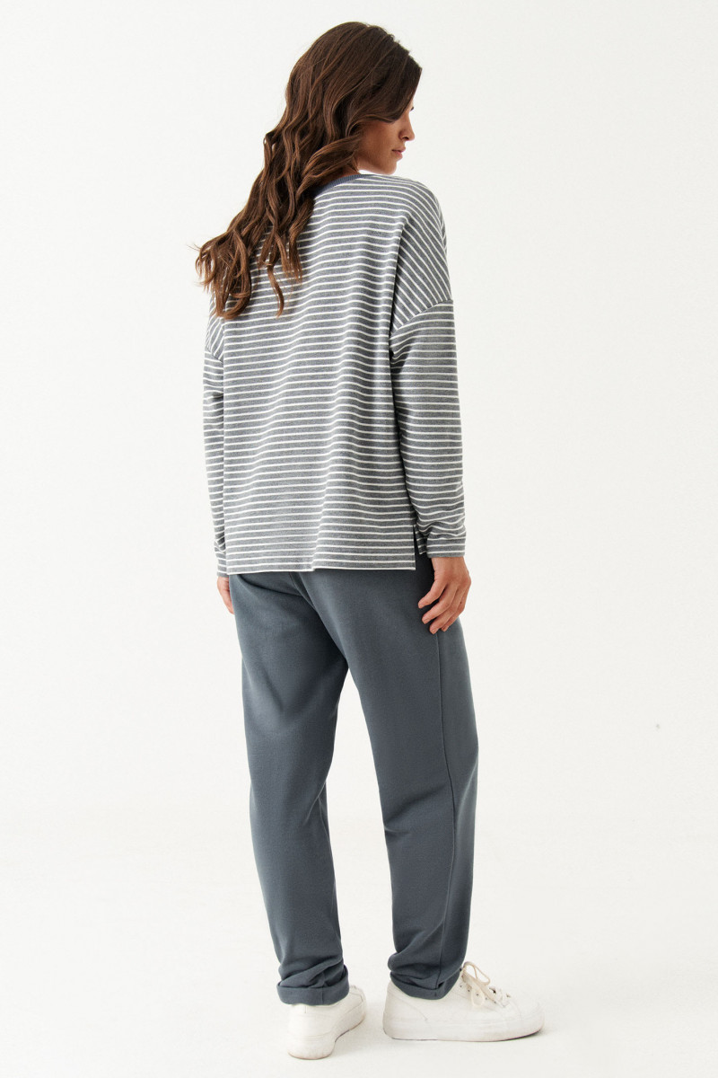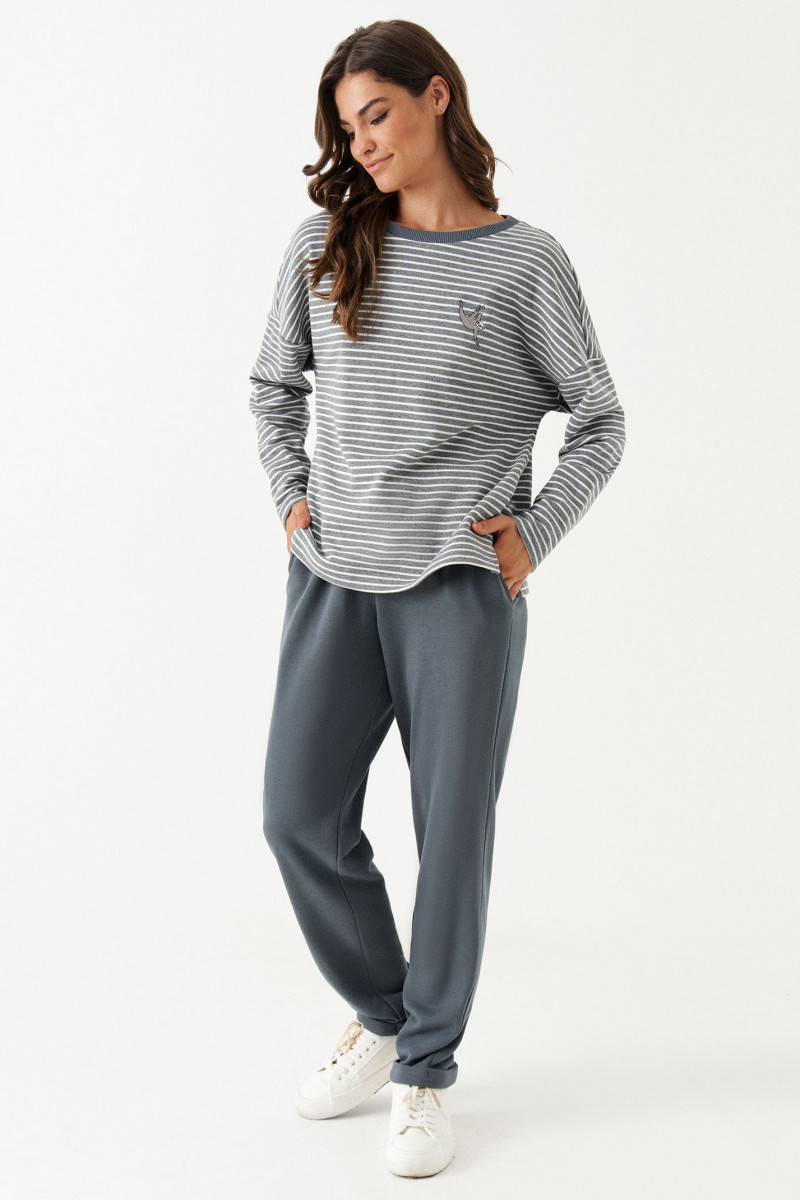 Костюм женский из смесового трикотажного полотна для повседневной носки прямого силуэта. Костюм состоит из джемпера и брюк. Джемпер из хлопчатобумажной ткани. На переде имеется дизайнерская вышивка ленивца. В боковом шве имеются разрезы. Горловина обработана слегка тянущейся косой бейкой. Рукав спущенный длинный. Брюки из смесовой ткани. Верхний срез брюк обработан притачным поясом на резинке. На задней части брюк располагается карман обманка с листочкой. Костюм будет отлично смотреться на любой фигуре, а также отлично подойдет для спорта. С данным костюмом вы всегда будете в центре внимания.