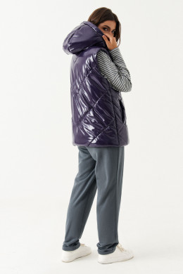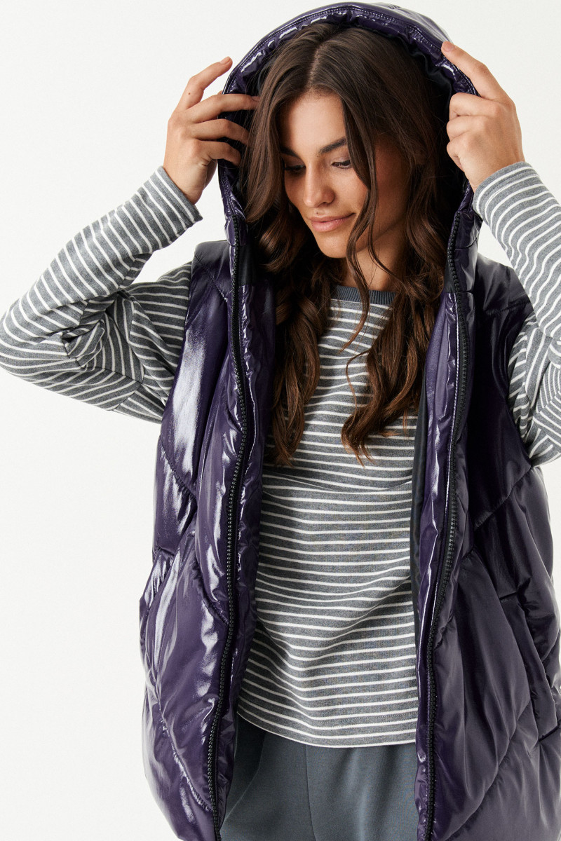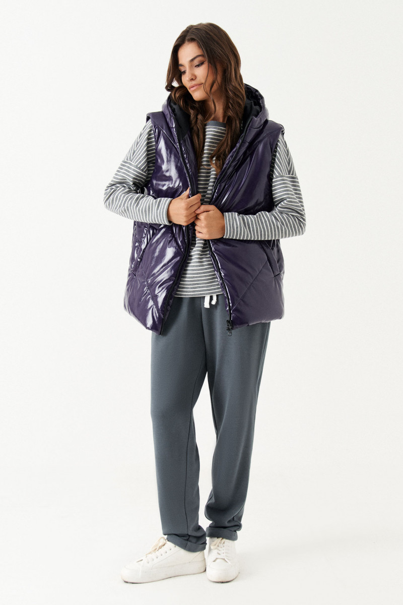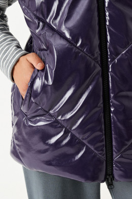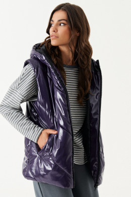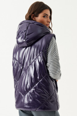 Жилет женский стеганный с лакированным покрытием для повседневной носки. Жилет прямого силуэта. На переде располагаются два кармана с листочкой, застежка на тесьму-молнию. Горловина обработана воротником с капюшоном. Жилет на подкладке. Данная модель жилетки станет вашей базовой вещью под любое изделие.