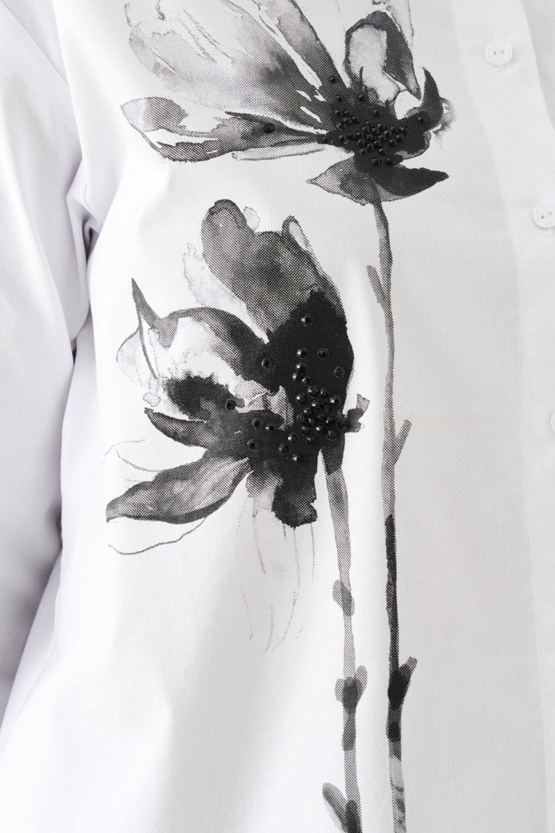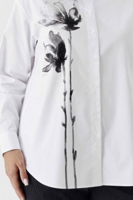 Блузка женская из смесовой ткани для повседневной носки прямого силуэта. Перед имеет принт и закругленную линию низа. Застежка на восемь обметанных петель и восемь пуговиц. Спинка имеет кокетку и две складки, а также закругленную линию низа. Горловина обработана рубашечным воротником с отрезной стойкой. Низ рукава обработан притачной манжетой с застежкой на одну обметанную петлю и одну пуговицу. Такой креативный вариант блузки обязательно привлечет к вам внимание. Блузка станет вашей любимой вещью в гардеробе.