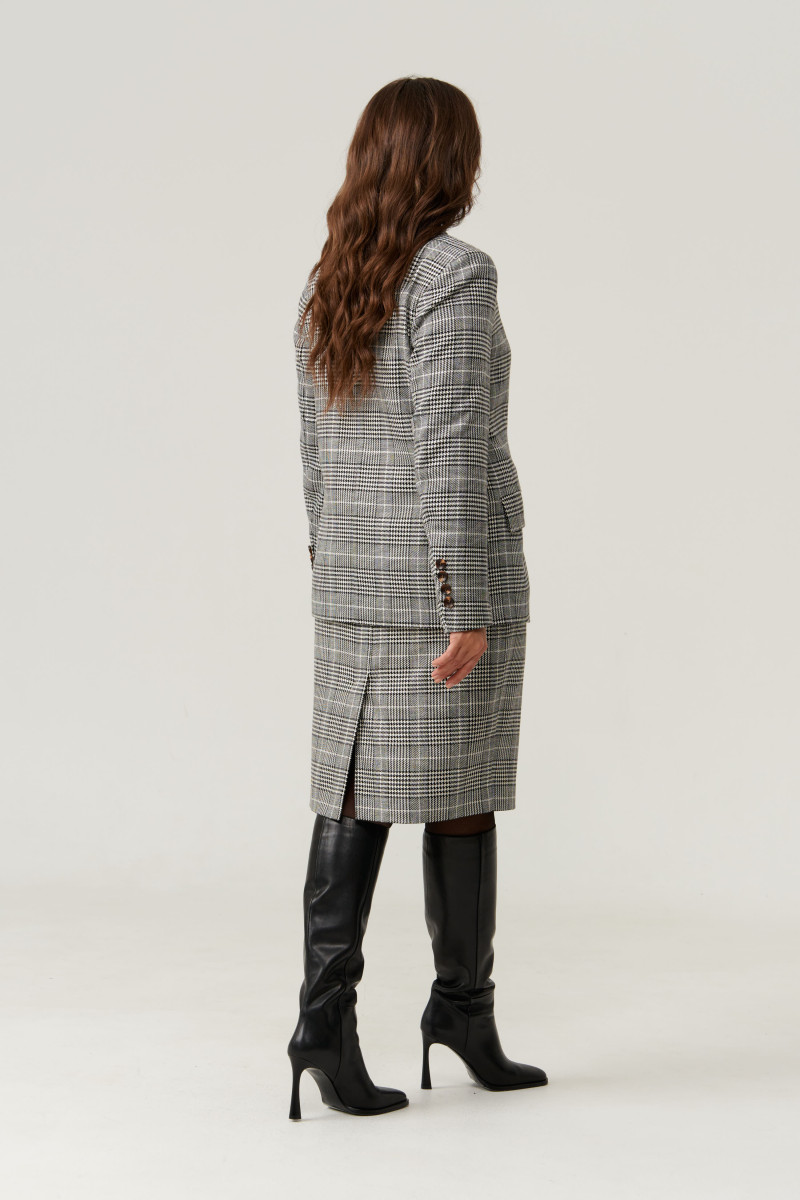 Этот жакет предназначен для повседневной носки и выполнен в классическом прямом силуэте. Застежка расположена по центральной бортовой линии и состоит из одной обметанной петли и одной пуговицы, что обеспечивает удобство и аккуратный внешний вид. Передняя часть украшена двумя карманами с клапанами, добавляющими функциональности и стилю. Горловина оформлена пиджачным воротником, придающим изделию элегантность. Рукава втачные, длинные, с низом, имитирующим шлицу, украшенным декоративными пуговицами — такой элемент добавляет изящества и декоративности. Внутри жакет подшит поливискозной подкладкой, что обеспечивает комфорт при носке и хорошую посадку. Длина изделия классическая, что делает его универсальным для различных ситуаций и сочетаний. Этот жакет отлично подойдет для повседневных образов, сочетаясь как с деловыми, так и с casual-луками.