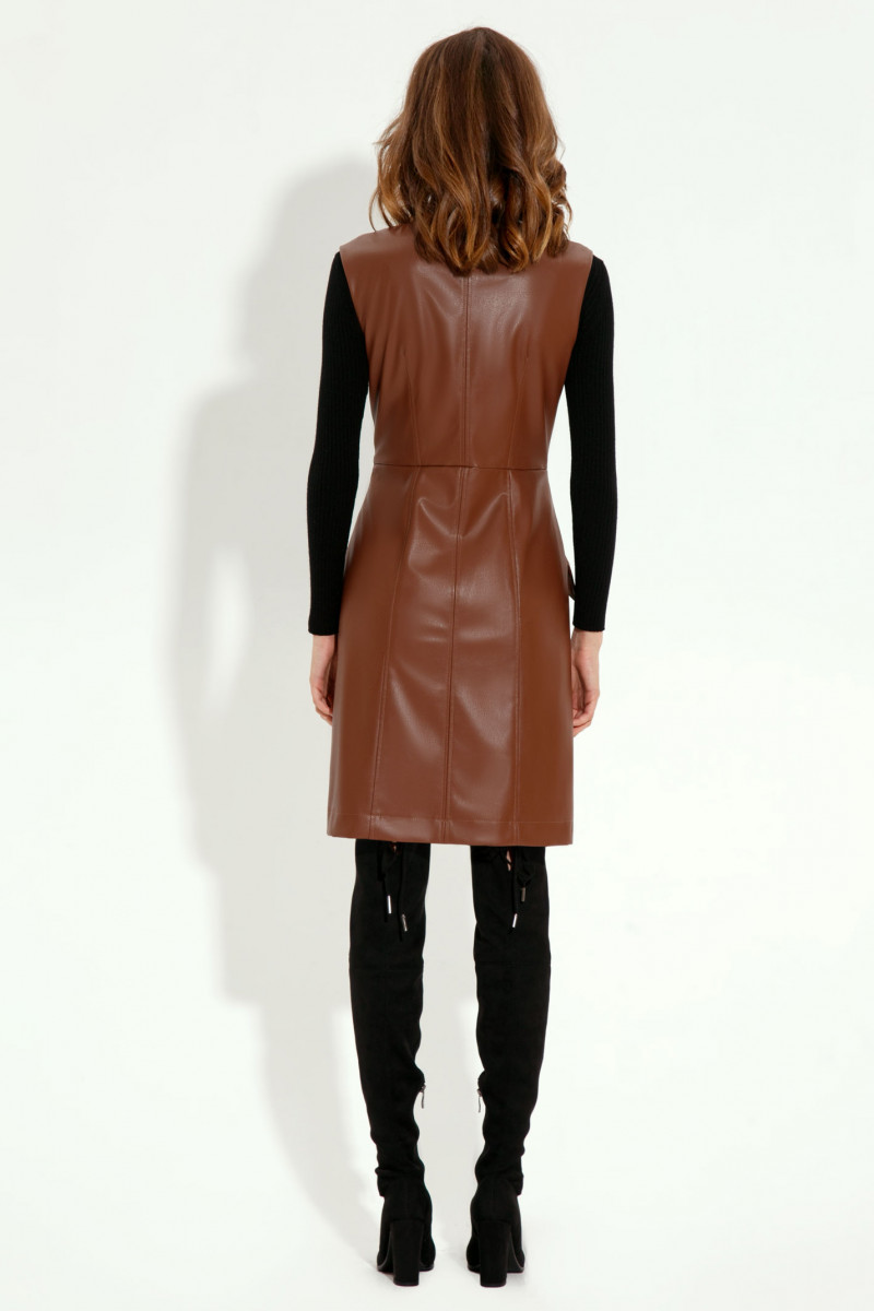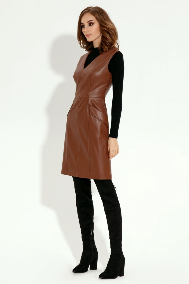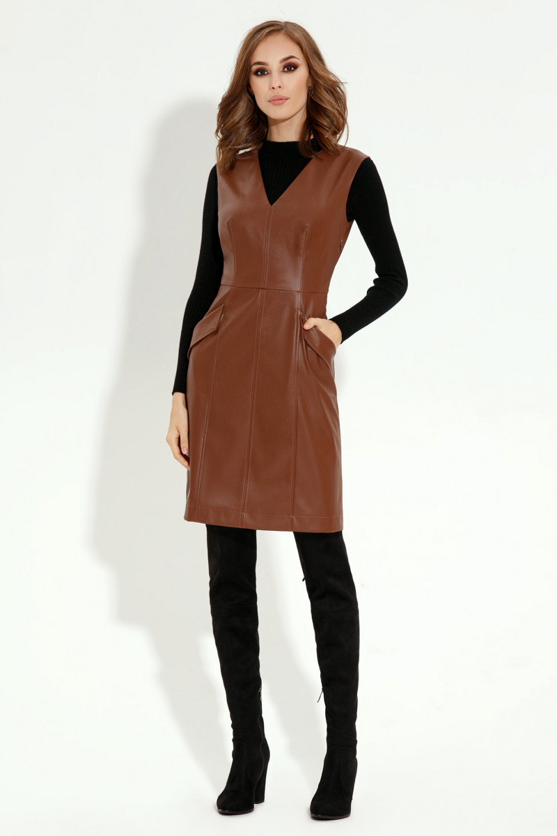 Трендом этого сезона является кожа. Эффектное платье полуприлегающего силуэта, слегка расширенное к низу, с V-образным вырезом горловины, отрезное по линии талии, с талиевыми вытачками, с рельефами от талии до линии низа и боковыми карманами, в боковом шве тесьма- молния, без рукавов, Спинка со средним швом, талиевыми вытачками, отрезное по линии талии, рельефные швы от талии до линии низа. В этом платье ваш образ будет многогранный: с блузой, рубашкой или гольфом.