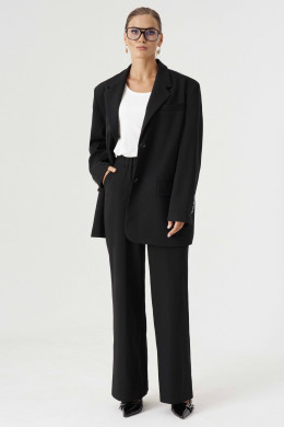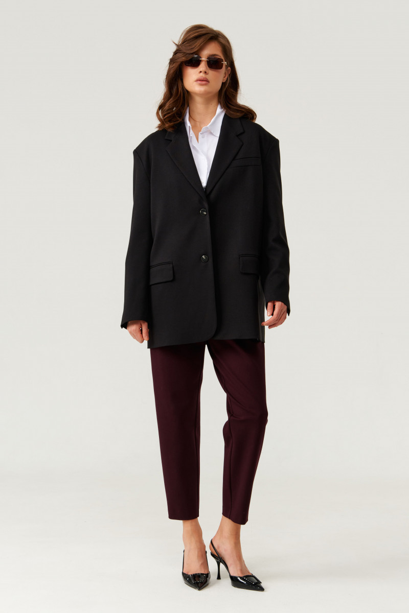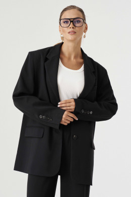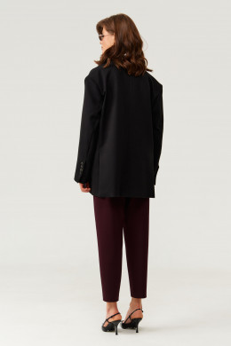 Жакет женский из поливискозной ткани для повседневной носки. Изделие прямого силуэта. Перед имеет нагрудный карман с листочкой, а также прорезной карман с клапаном и двумя обтачками. По переду имеются вертикальные рельефы, идущие от проймы до линии низа изделия. Спинка имеет средний шов и вертикальные рельефы идущие от линии проймы до низа изделия. В среднем шве по спинке располагается шлица. Горловина обработана пиджачным воротником. Длина изделия до середины бедра. Рукав длинный втачной со шлицей, застежка на четыре обметанные петли и четыре пуговицы.