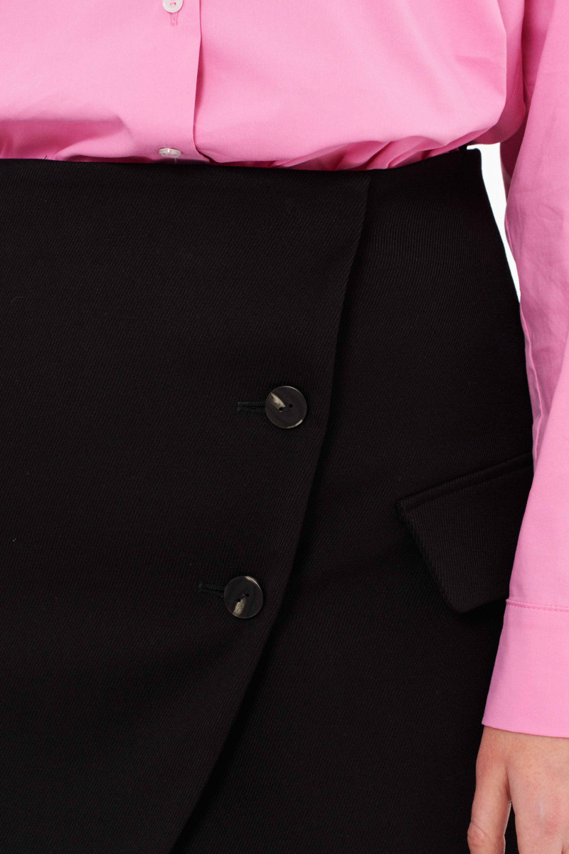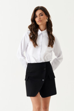 Юбка из смесовой ткани, эко кожи для повседневной носки. Юбка полуприлегающего силуэта на запах. По юбке располагаются прорезные карманы с клапаном. По спинке имеются талиевые вытачки. Длина изделия до середины бедра. Красивая и стильная юбка отлично будет смотреться на вашей фигуре.