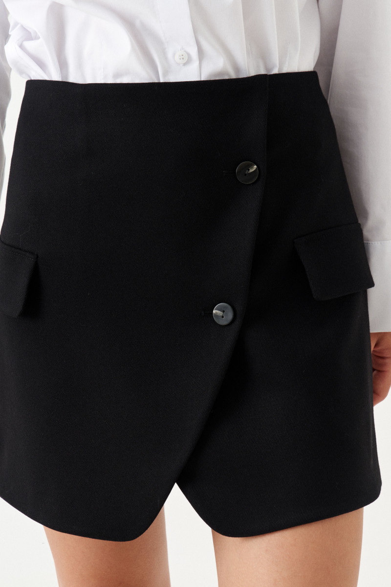 Юбка из смесовой ткани, эко кожи для повседневной носки. Юбка полуприлегающего силуэта на запах. По юбке располагаются прорезные карманы с клапаном. По спинке имеются талиевые вытачки. Длина изделия до середины бедра. Красивая и стильная юбка отлично будет смотреться на вашей фигуре.