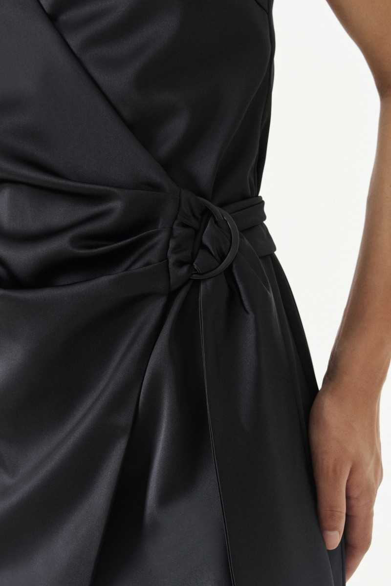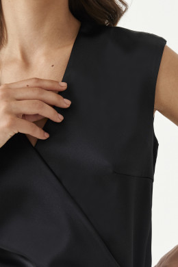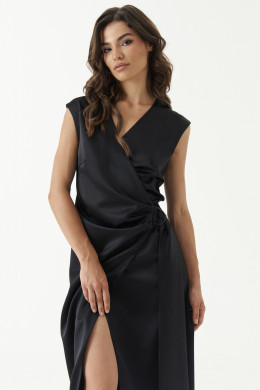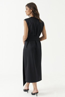 Платье женское из смесовой ткани полуприлегающего силуэта. Перед на запах с регулирующим поясом. Спинка с поясом. Горловина V-образная. Платье без рукавов, длина ниже колена. Идеальный вариант для вечерних прогулок и мероприятий. Данное платье очарует всех вашим изящным видом.