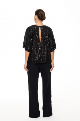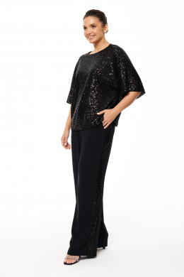 | 56 | Блузка: Длина изделия - 63см, Ширина плеча - 45см, Ширина по груди - 67см, Ширина по низу - 67см, Ширина рукава под проймой - 32см; Брюки: Высота посадки - 32см, Длина брюк с поясом - 109см, Длина по внутреннему шву - 81см, Ширина брючин сверху - 78см, Обхват брюк по низу - 60см, Ширина по бедрам - 68см, Ширина по талии - 86см; |