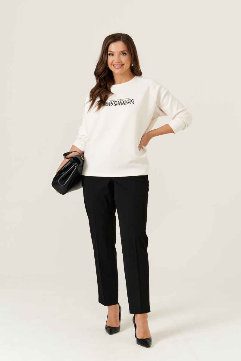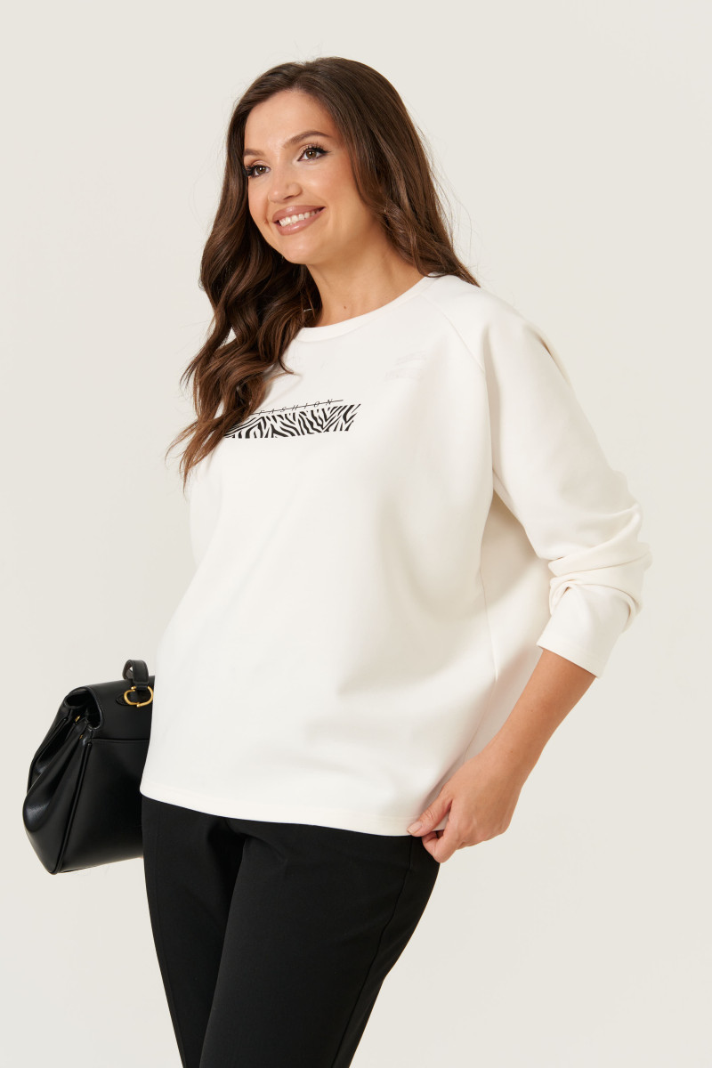 Этот женский джемпер выполнен из мягкого и приятного трикотажа, который обеспечивает комфорт в носке. Модель прямого силуэта подходит для разных типов фигуры и отлично сочетается с различными образами. Перед украшен дизайнерской печатью с интересным принтом и надписью, что придает изделию индивидуальность и стиль. Горловина чуть расширенная, обработана притачной тесьмой, что добавляет аккуратности и завершенности образу. Длинные рукава реглан обеспечивают свободу движений и комфорт. Классическая длина делает этот джемпер универсальным элементом гардероба. Молочный оттенок легко сочетается с разными цветами и стилями, а его идеальная посадка подчеркнет вашу фигуру и привлечет восхищенные взгляды окружающих.
