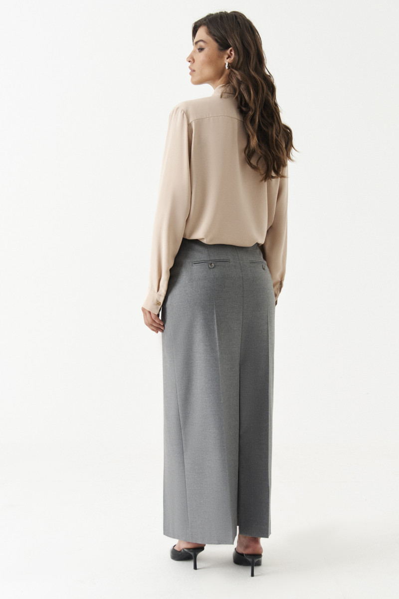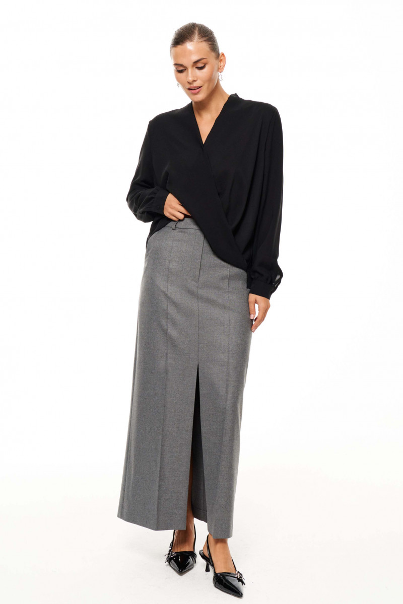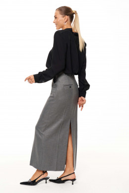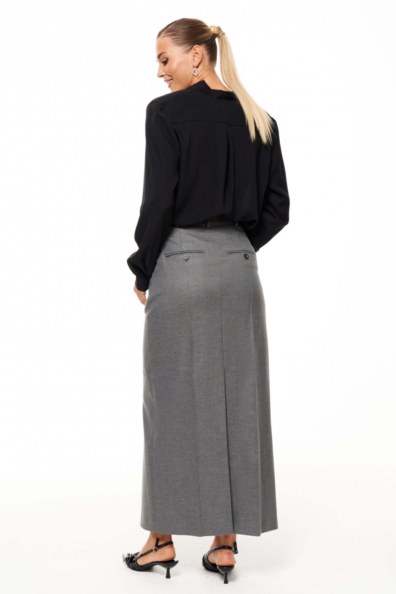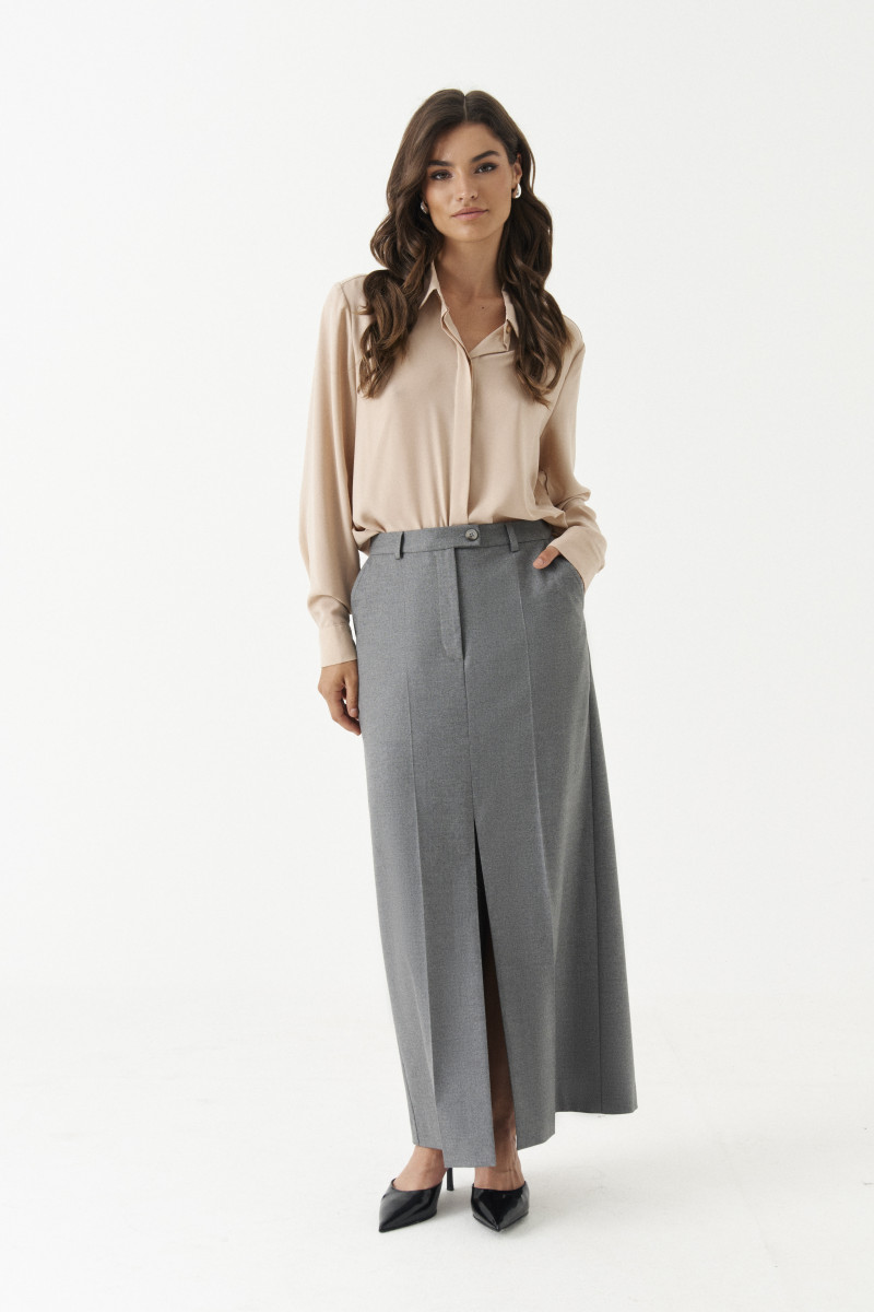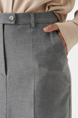 Юбка женская из смесовой ткани для повседневной носки. Верхний срез юбки обработан притачным поясом с застежкой на одну петлю и одну пуговицу, имеется застежка на тесьму-молнию и разрез в среднем шве переднего полотнища юбки. Заднее полотнище со средним швом, талиевыми вытачками и прорезным карманом с листочкой, а также разрезом в среднем шве. Юбка имеет в боковых швах карманы с подкройным бочком. Юбка станет базой в вашем гардеробе.